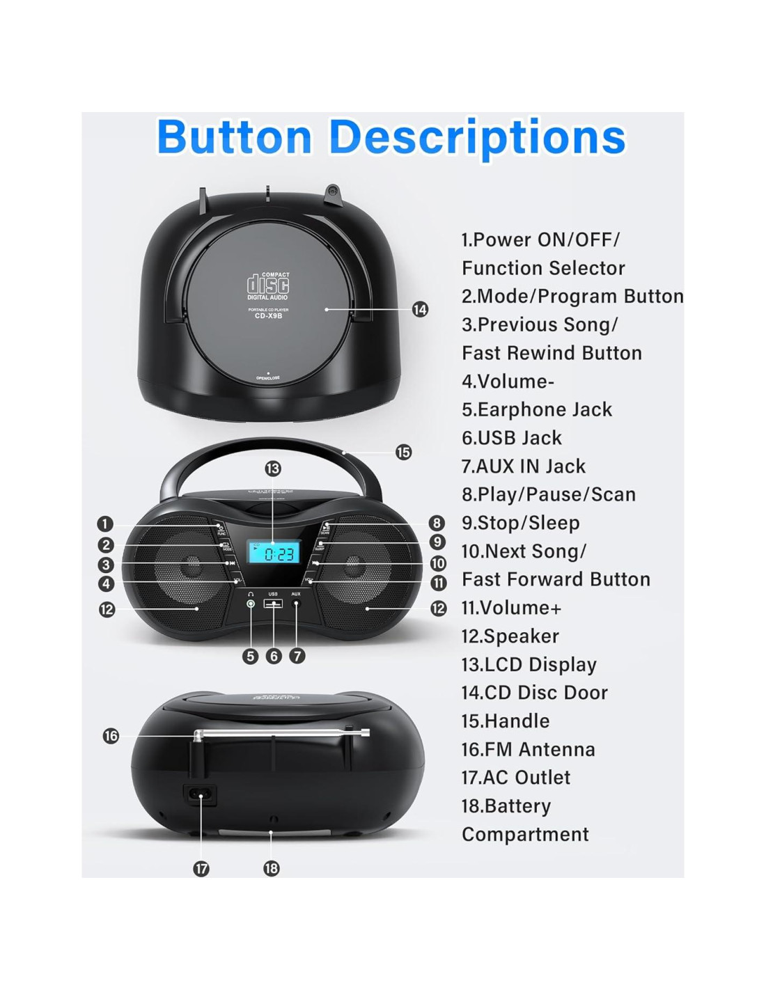 - [Compatibilidad de Múltiples Formatos] Nuestro reproductor de CD boombox portátil soporta CD, Bluetooth, USB, AUX y reproducción de radio FM. Reproduce CDs, CD-Rs y CD-RWs con funciones de reproducción normal, ciclo único, ciclo completo y aleatorio para opciones musicales versátiles