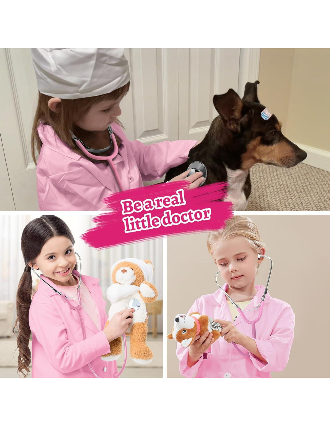 - CONJUNTO COMPLETO DE DISFRAZ MÉDICO: El set de juego de doctor para niños de Phobby viene con un estetoscopio real que los niños pueden usar para escuchar latidos del corazón. Una placa de identificación de doctor y una tarjeta pueden contener las propias fotos de los niños. Todo esto hace que los niños se vistan para lucir como el personaje