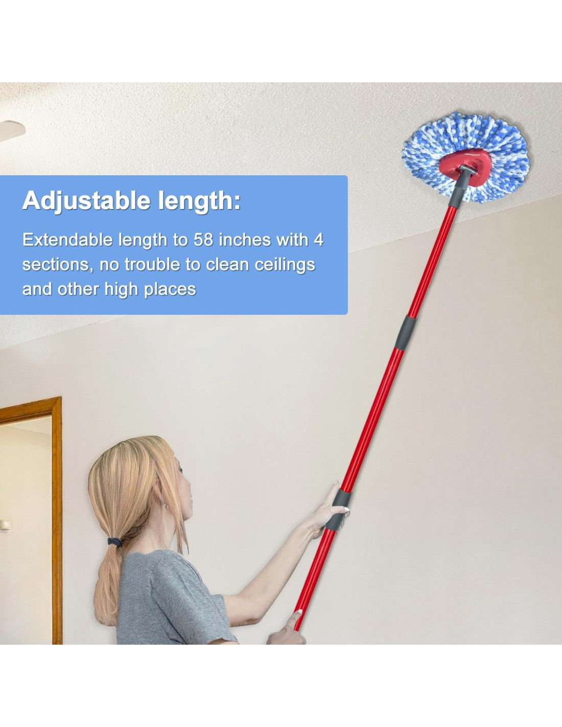 - REEMPLAZO DE MANGO DE MOP DE 76.2 cm a 147.3 cm para OCEDAR: Con una longitud extensible de 76.2 cm a 147.3 cm, el palo de mop para Ocedar se puede ajustar fácilmente para adaptarse a tu altura y necesidades de limpieza. No es necesario agacharse o ponerse en cuclillas mientras limpias, haciendo que la limpieza sea muy fácil.