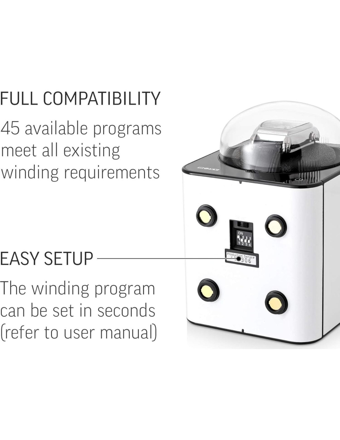 - TOTAL COMPATIBILIDAD: 45 programas de enrollado disponibles satisfacen todos los requisitos de enrollado existentes. Puedes establecer el número de Giros por Día de 650 a 3600 TPD.