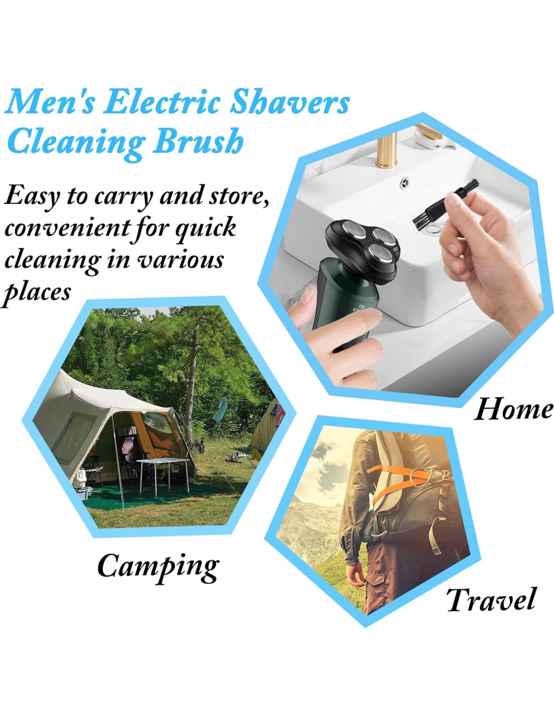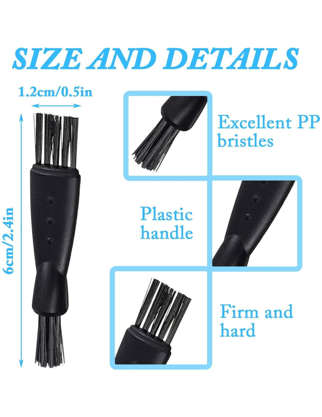 - [Diseño de Doble Cara] -- El cepillo de limpieza para afeitadoras eléctricas adopta un diseño de doble cabeza, con cerdas de diferentes longitudes y grosores en ambos extremos, que pueden limpiar eficazmente varios espacios. El mango del cepillo de limpieza para recortadoras eléctricas está diseñado con partículas antideslizantes para un agarre cómodo y una fácil aplicación.