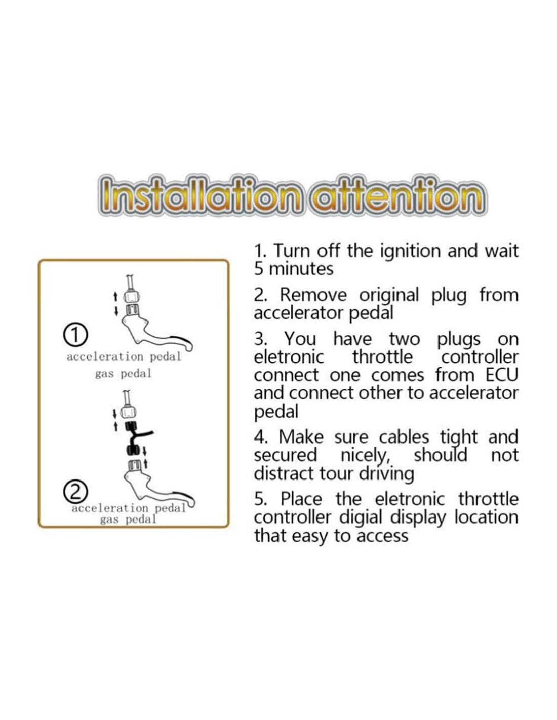 - 4. Instalación: Instale este acelerador de acelerador cuando el automóvil esté apagado y siga el manual del usuario o la foto de instalación, solo enchufe y juegue. Toma alrededor de 5 a 10 minutos. Todos los ajustes deben hacerse en un entorno de conducción SEGURO. Asegúrese de que su vehículo haya estado apagado durante 3-5 minutos antes de retirar el enchufe del pedal. Nota: Si desconecta el enchufe del acelerador demasiado pronto, recibirá una luz de verificación del motor ya que el EUC aún tiene energía y está detectando su sensor como defectuoso. Reinicie el motor 5-10 veces, la falla se eliminará automáticamente.
