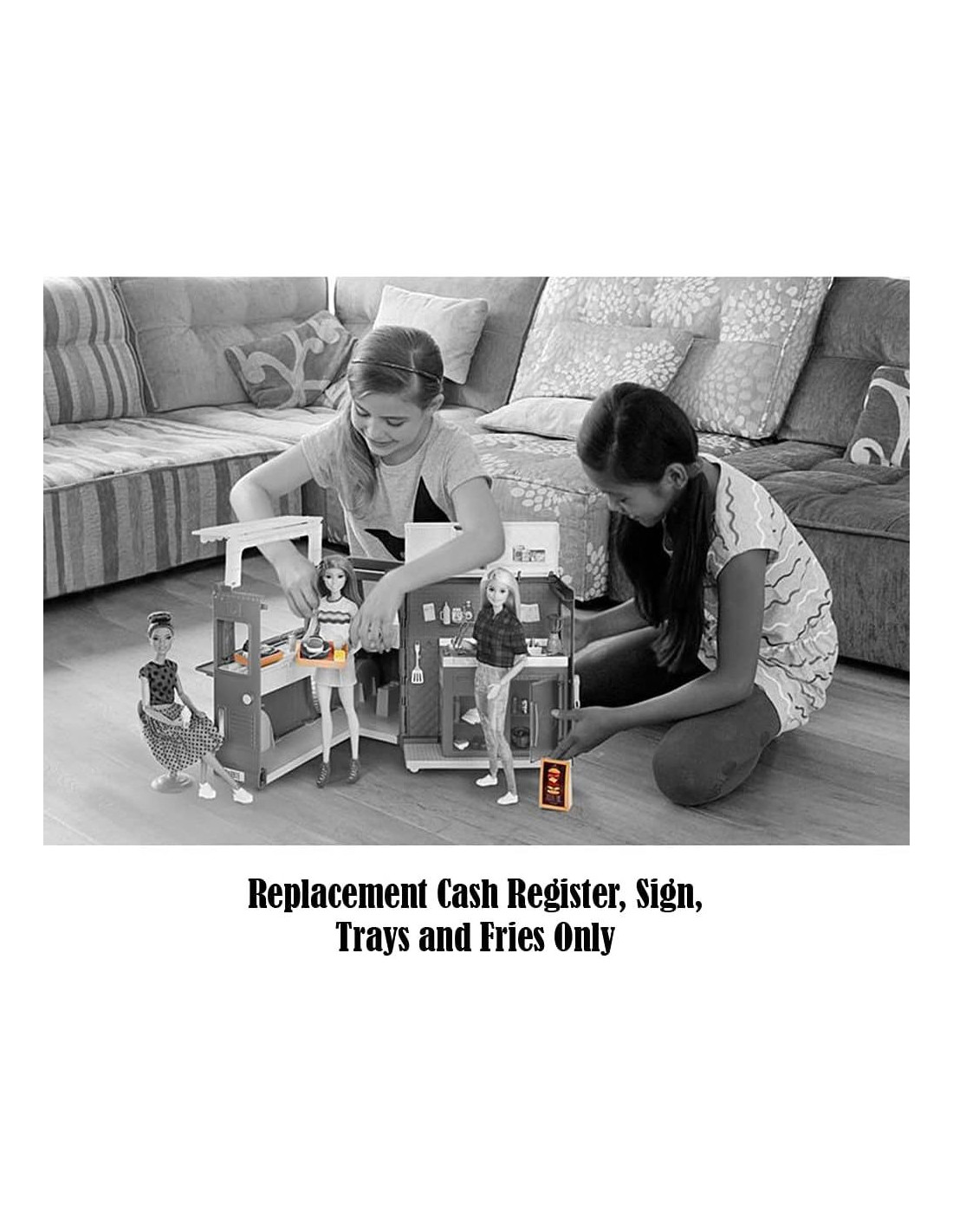 Piezas de repuesto para el juego de camión de comida de la casa de muñecas GMW07. Incluye caja registradora de repuesto, cartel, 2 bandejas y papas fritas.