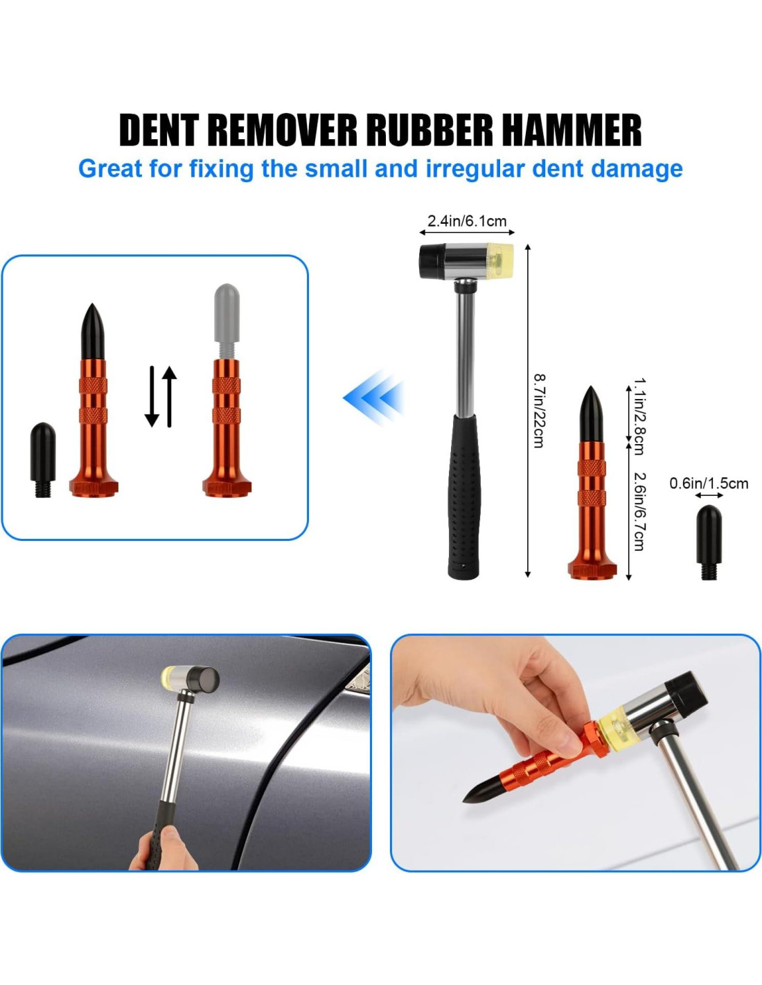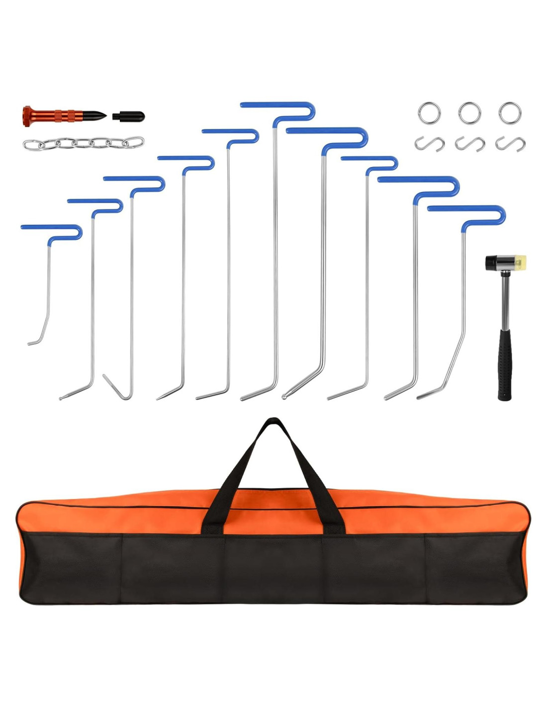 - Kit Perfecto de 20 Piezas: Con el perfecto kit de 20 piezas (10 varillas, 1 martillo de goma, 3 ganchos estilo O, 3 ganchos estilo S, 1 cadena, 1 herramienta de golpeo con dos cabezales, 1 bolsa) varillas de reparación de abolladuras sin pintura, puedes reparar tu auto sin esfuerzo y sin dañar la pintura original de la carrocería de tu auto. El kit de eliminación de abolladuras es excelente para sacar abolladuras de manera eficiente y segura. También es adecuado para superficies metálicas, como automóviles, refrigeradores, motocicletas y lavadoras.