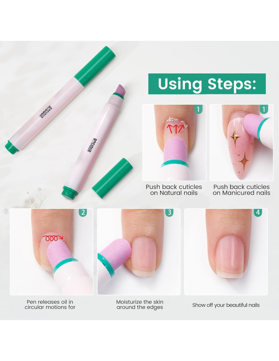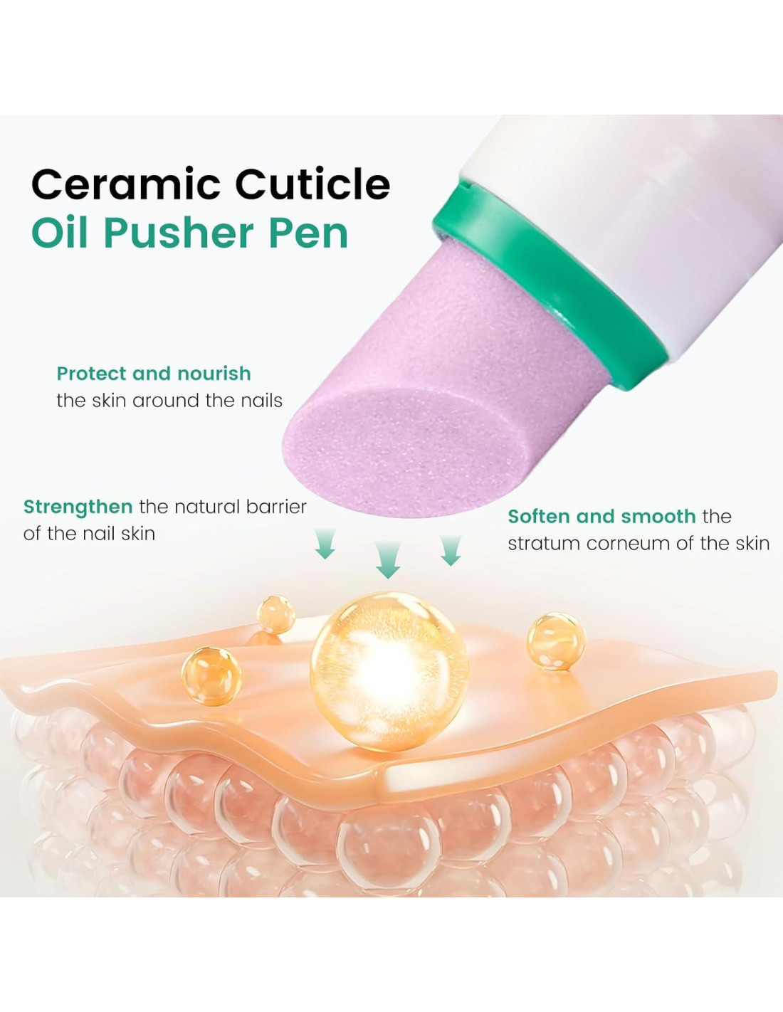 - Aceite para Cutículas Todo en Uno: Este bolígrafo para cutículas de cerámica combina reparación, hidratación y realce de brillo en un solo paso. Elimina sin esfuerzo las cutículas sueltas y las pieles muertas mientras infunde simultáneamente el borde de la uña con aceites esenciales nutritivos y una profunda hidratación. Transforma uñas secas y ásperas en una perfección saludable y brillante