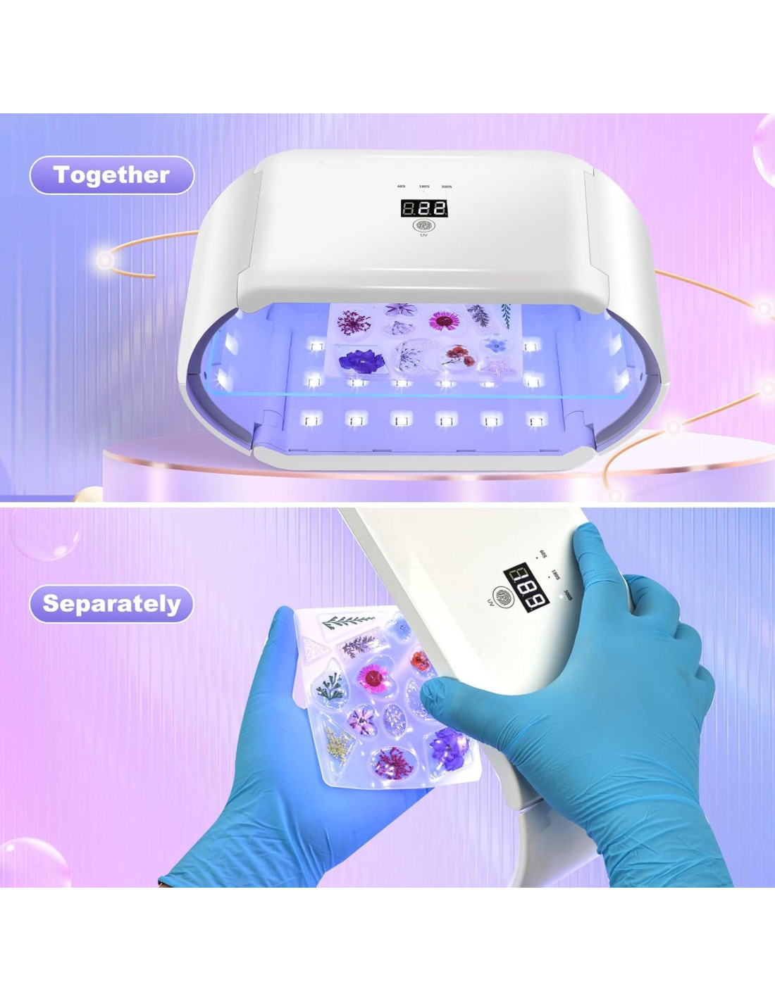 - Paquete Incluido: 1 x Luz UV de 48w; 1 x cables USB-TYPC; 1 x Adaptador de Alimentación; 1 x Tablero de Almacenamiento Transparente; 1 x Molde de Silicona; 2 pares de Guantes Desechables; 1 x Instrucción.