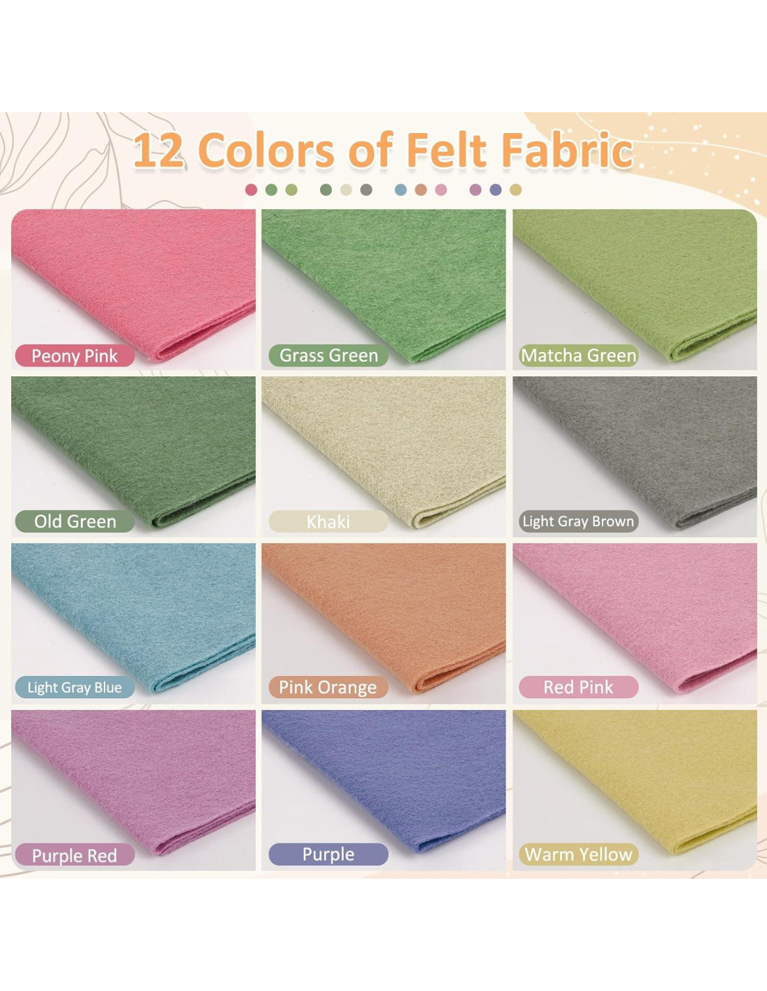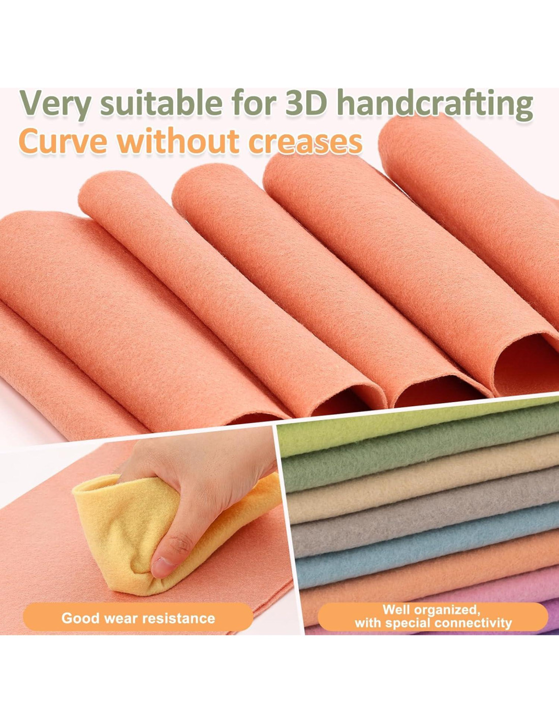 - [Alta Calidad] : Nuestro fieltro está hecho de fibra de poliéster y es resistente a la decoloración. Se puede cortar limpiamente y es opaco a la luz, puede soportar un uso prolongado sin desgastarse o rasgarse, o desmoronarse en el borde. Mantiene bien su forma y es fácil de cortar, doblar, coser, planchar y engrampado para tus necesidades.