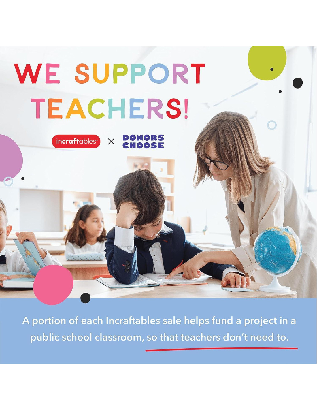 - FINANCIANDO ESCUELAS EN EE.UU.: En asociación con DonorsChoose, una organización sin fines de lucro de educación líder, una parte de cada venta de Incraftables se destina a la financiación necesaria en las escuelas públicas de EE.UU. para donar suministros de arte y manualidades para que los maestros no tengan que pagarlos de su propio bolsillo.