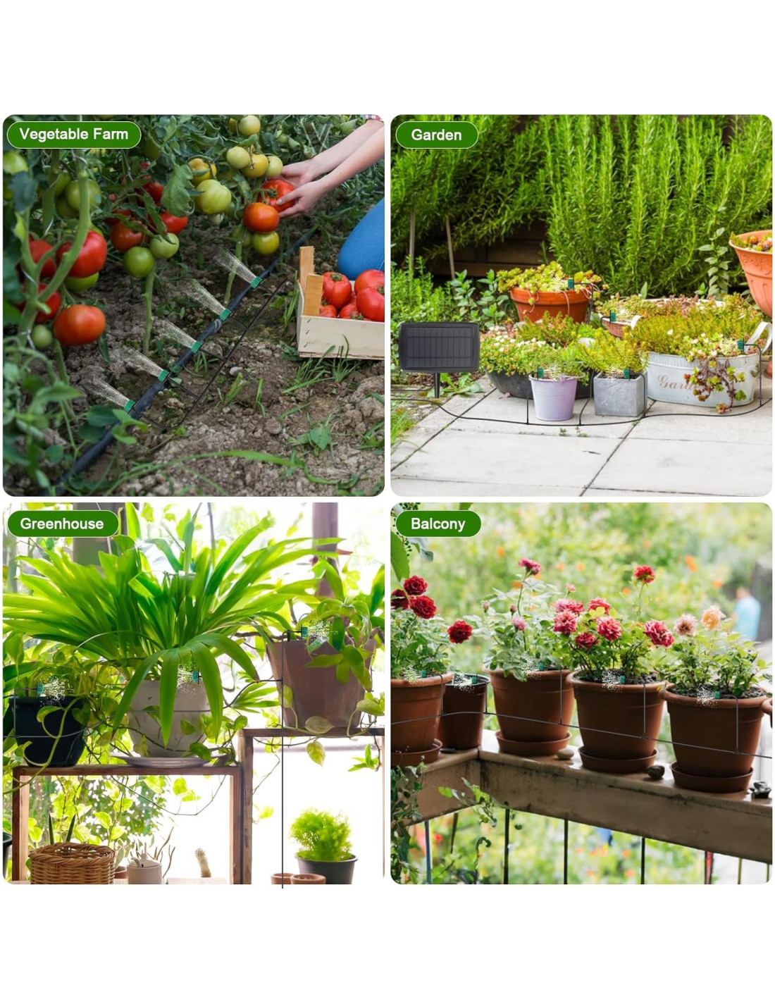- Sistema de Riego Automático para Plantas: Los kits de riego alimentados por solar hacen que el cuidado de las plantas sea más conveniente, eficiente y sostenible, y son muy adecuados para su uso cuando el acceso a electricidad o grifos de agua es limitado. Diseñado específicamente para regar plantas automáticamente durante vacaciones, horarios ocupados o temporadas secas. Ahorra la molestia del riego manual y pasa más tiempo disfrutando de tu exuberante oasis.