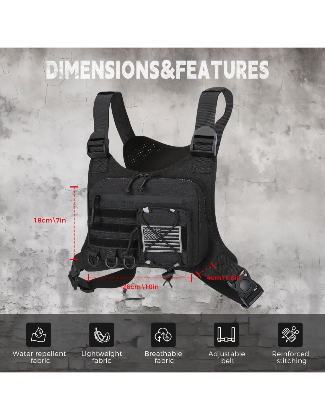 - Ajustable y se adapta a personas más grandes. Dos correas para los hombros son ajustables, por lo que la bolsa de pecho puede ser utilizada por hombres y mujeres de diferentes tamaños. Y las correas alrededor de la cintura son elásticas y ajustables también, con el objetivo de que todas las personas disfruten de esta mochila de pecho.