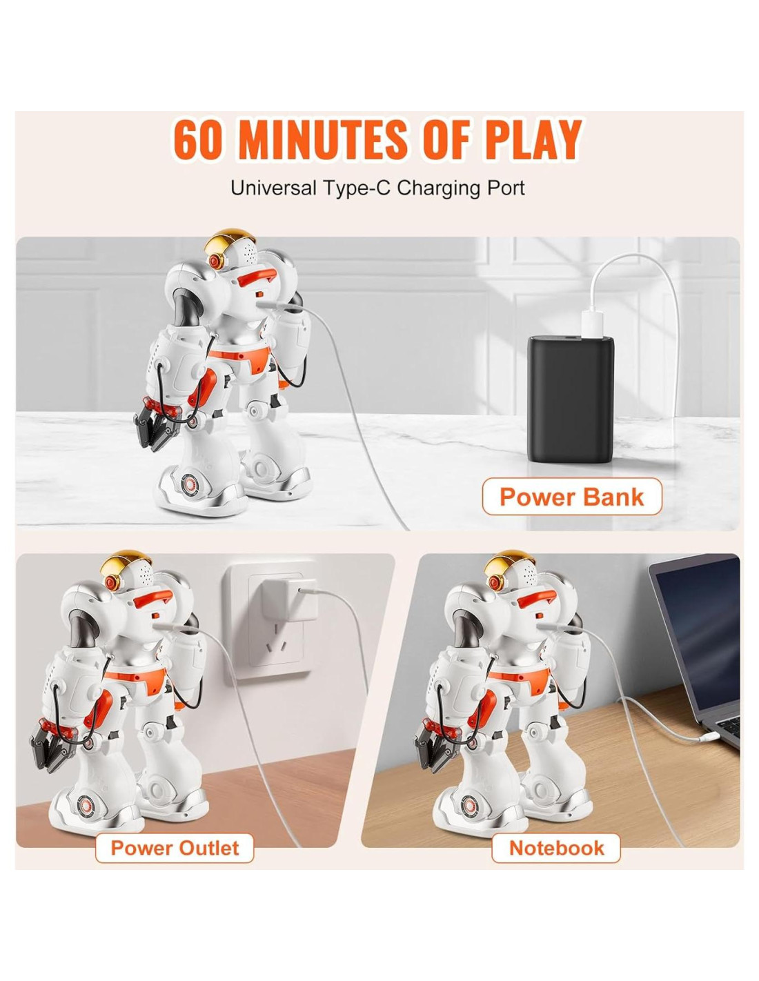 - [Carga Tipo-C Fácil]: ¡Cárgalo con facilidad usando el puerto Tipo-C! Puedes cargar el robot de los niños a través de una conexión USB a un banco de energía, enchufe o computadora, lo que añade a su practicidad. Es un regalo perfecto para Navidad, Año Nuevo, cumpleaños, Halloween, regalos de graduación o cualquier ocasión especial que fomente la creatividad y proporcione un disfrute sin fin.