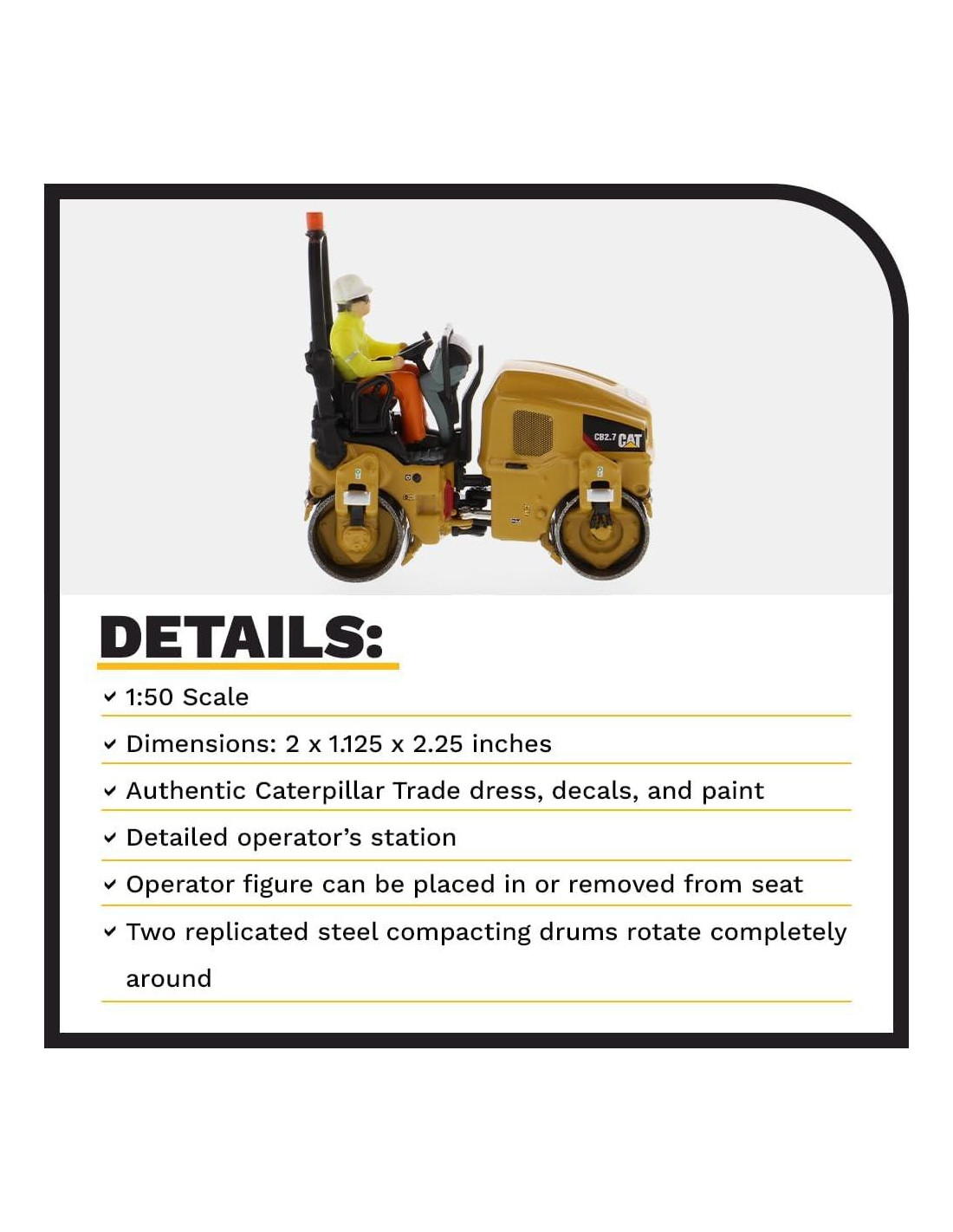 - REPLICA ESCALADA AUTÉNTICA CON DETALLES EXCEPCIONALES - El compactador utilitario Caterpillar CB-2.7 de Diecast Masters en escala 1:50 incluye pintura negra y amarilla auténtica de Caterpillar, calcomanías y diseño comercial. Los dos tambores de compactación del CB-2.7 se pueden rotar a mano y se mueven libremente.