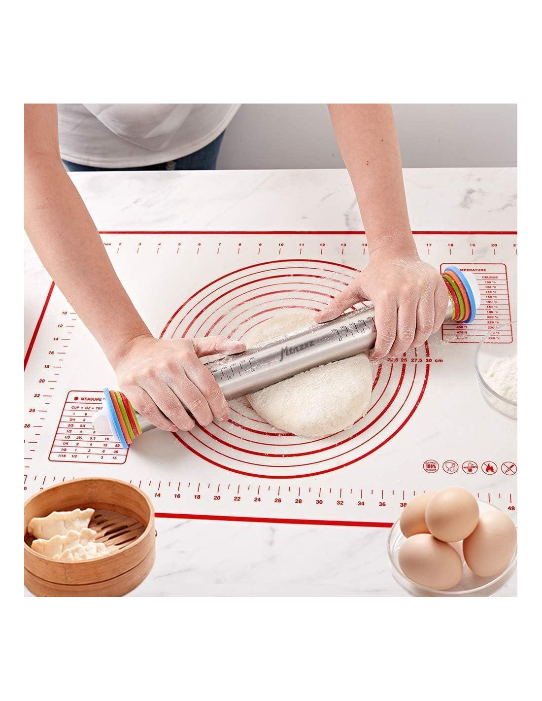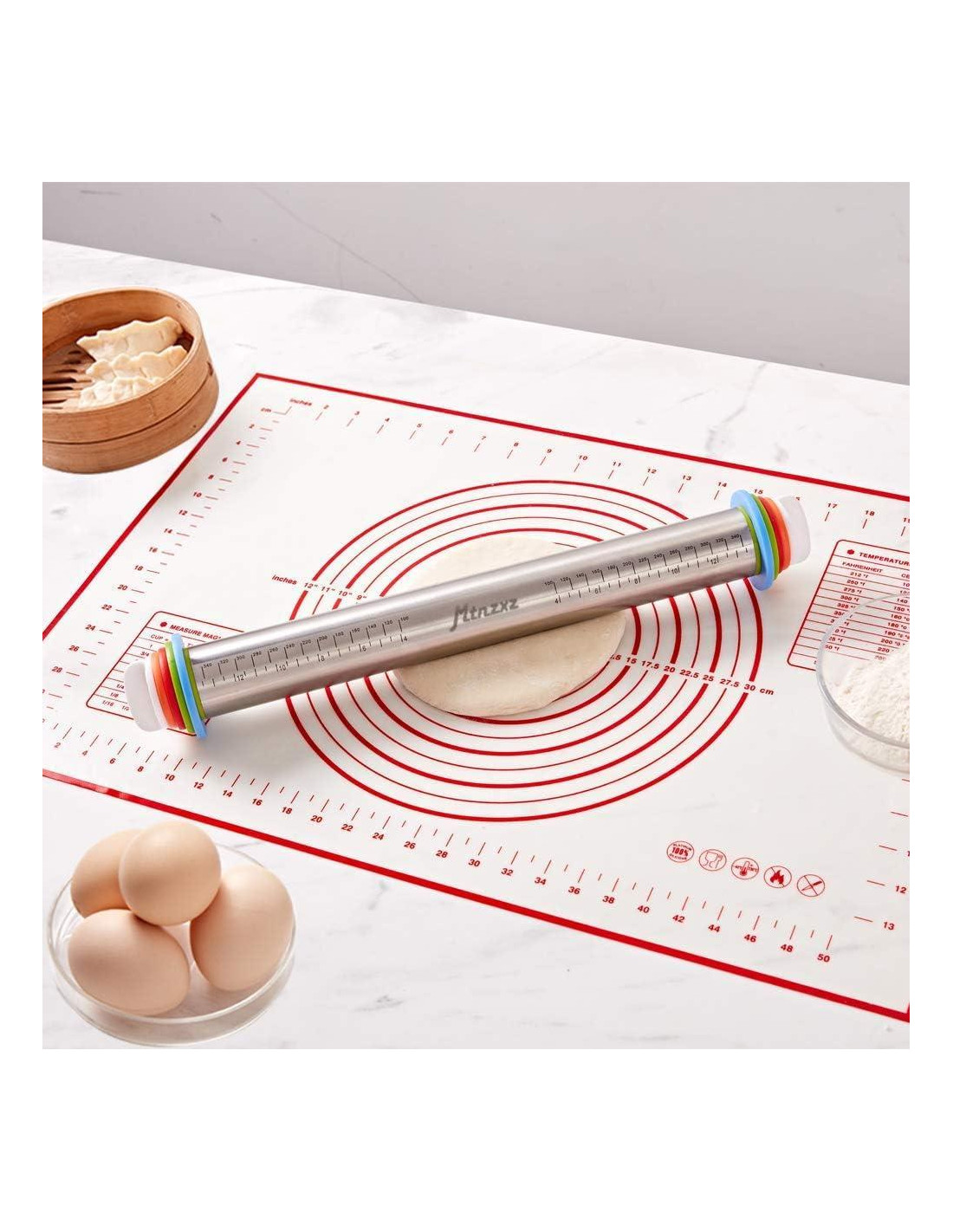 Amamos a nuestros clientes y estamos obsesionados con su satisfacción. Nuestro compromiso ha sido con productos de alta calidad. ¡La mejor relación calidad-precio en el mercado! 1*Rodillos de Acero Inoxidable Ajustables, 1*Alfombrilla de Silicona para Repostería con medidas y tablas de conversión. Hecho de acero inoxidable 304 de grado alimenticio. Acabado de acero inoxidable cepillado de alta calidad para una larga vida, muy fácil de limpiar. Es más fácil enrollar pasteles, panes, galletas y masa utilizando el producto, ¡haciendo que cocinar y hornear sea tan simple! Equipado con anillos removibles de 1/16, 1/8, 1/4 y 3/8 pulgadas (2mm/4mm/6mm/10mm), se puede enrollar fácilmente para obtener el grosor de masa deseado. Masa de Pastel, Masa de Pizza Gruesa. Galletas Crujientes, Masa de Pizza Fina. Todas las Galletas Deliciosamente Masticables, Pasteles. Tortellini, Pierogi, Pasta y Fideos. Medición: Al usar la medición precisa en la superficie de la alfombrilla para pasteles, puedes amasar fácilmente la masa al tamaño requerido. Multifuncional: Puede hornear casi todo, incluyendo galletas, panes, pasteles y dulces. Y se puede usar como una alfombrilla de mesa debido a su gran tamaño. No pegajoso: No necesitas preocuparte de que la masa, el pastel, la carne o los dulces suaves se peguen a la alfombrilla para hornear. Cualquier alimento se puede quitar fácilmente de la alfombrilla. Aplicable a altas y bajas temperaturas: Rango de temperatura: -40 a 232C.