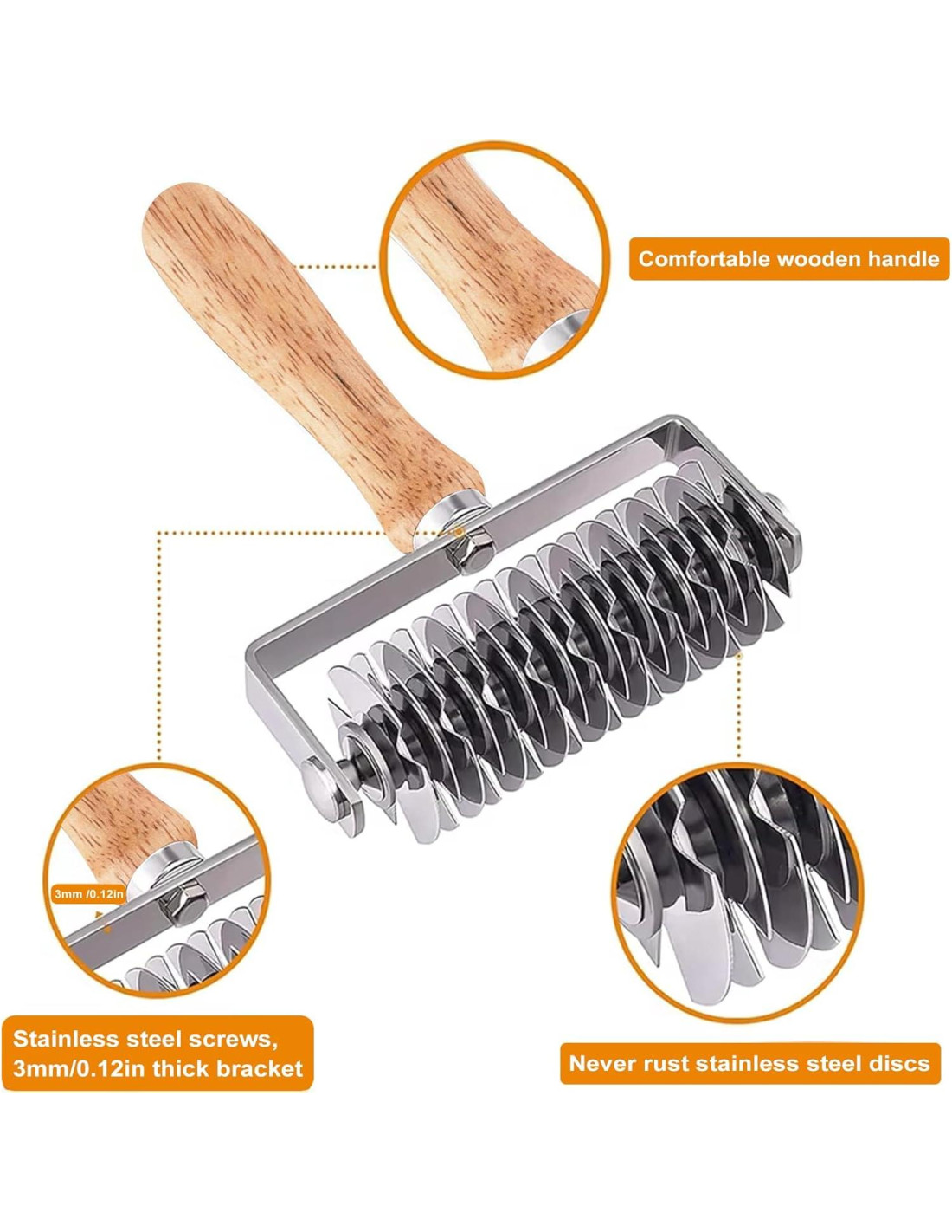 - Acero inoxidable 430 de alta calidad y roble: Nuestra herramienta de rodillo para pizza tiene acero inoxidable 430 de alta calidad y mango de roble, que es duradero y se puede usar durante mucho tiempo. Es una herramienta de horneado confiable.