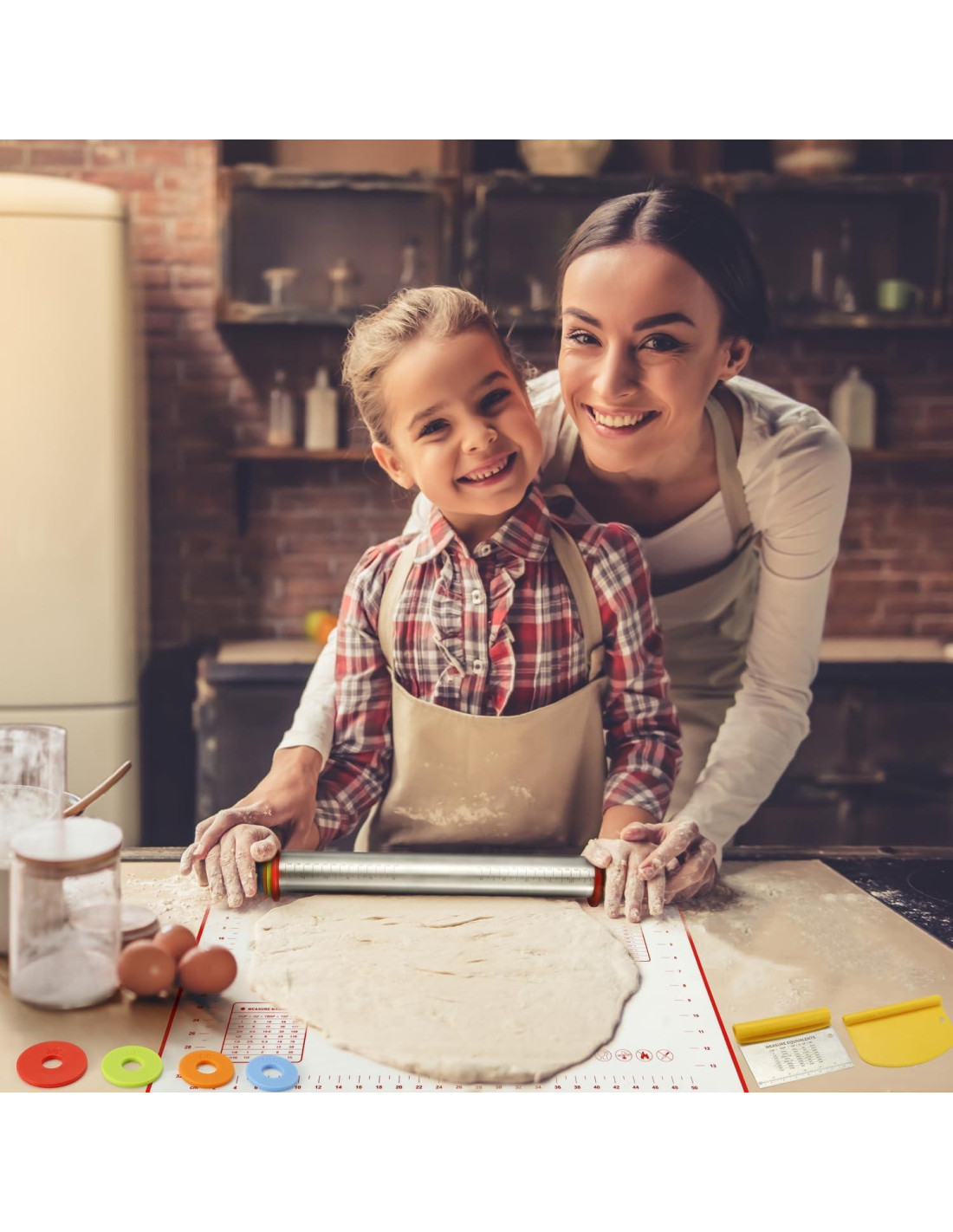 Amamos a nuestros clientes y estamos obsesionados con su satisfacción. Nos hemos comprometido a ofrecer productos de alta calidad al mejor valor. Por eso desarrollamos un kit de herramientas de cocina para cocinar/hornear que incluye: - Alfombrilla de Medición de Silicona Grande - Rodillo de Acero Inoxidable con anillos de grosor ajustables - Raspador y Cortador de Banco 2 en 1
