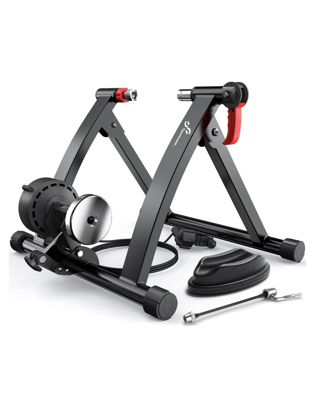 - Viaje Silencioso, Suave y Estable: Disfruta de un entrenamiento enfocado con ruido mínimo. El diseño de rueda magnética de este soporte de entrenador de bicicleta interior reduce la fricción para un giro suave y silencioso, por lo que puedes entrenar en cualquier momento sin molestar a los demás. (Nota: Los niveles de ruido pueden variar según el material y la banda de rodadura del neumático; se recomiendan neumáticos lisos o de carretera.)