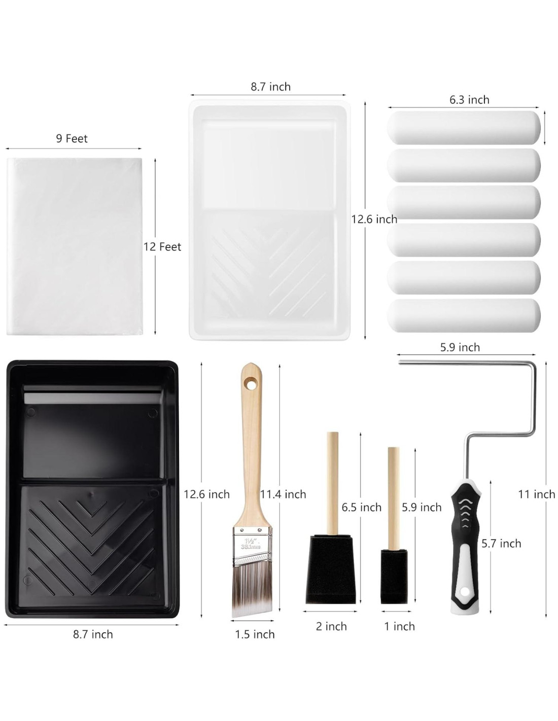 - Componentes incluidos: Cubiertas de rodillo de pintura de espuma de 6 pulgadas, brocha de pintura y plástico protector, marco de rodillo de pintura de 6 pulgadas, bandeja de pintura de 6 pulgadas con forro