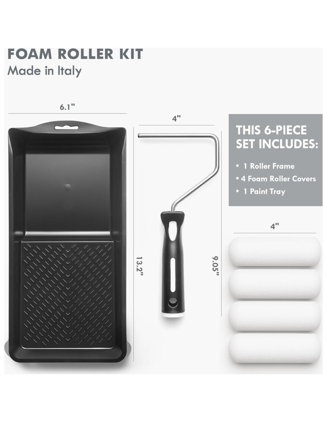 - HECHO EN ITALIA: El kit de rodillos de pintura de espuma de 6 piezas de Remolika está fabricado en Italia, ofreciendo un rendimiento y precisión premium. Este juego de rodillos de pintura de espuma incluye un marco de rodillo duradero de 4" (10.16 cm), 4 rodillos de pintura de espuma de alta densidad y una bandeja de pintura, todo lo necesario para un acabado profesional e impecable.