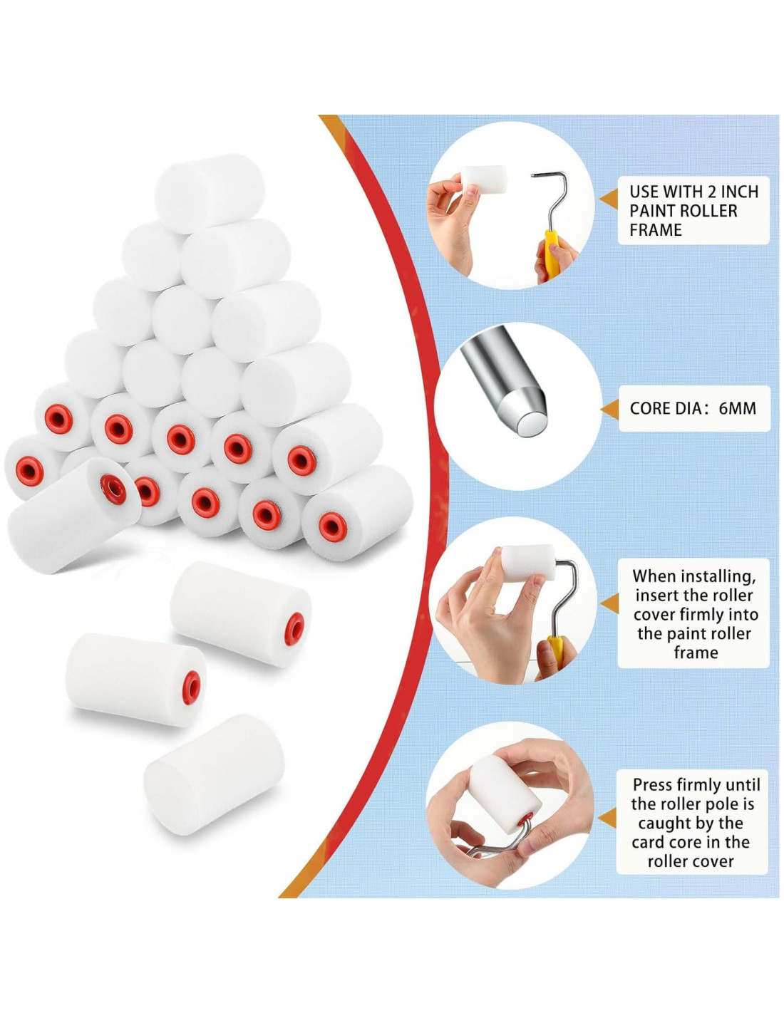 - Paquete Rico: se te proporcionará 40 pcs cubiertas de rodillo de pintura de espuma mini que se ajustan a marcos de rodillo mini de 2 pulgadas (5.08 cm), suficiente para que reemplaces y compartas para trabajos de pintura diarios; No es necesario preocuparse por limpiar el rodillo de pintura mini aplicado