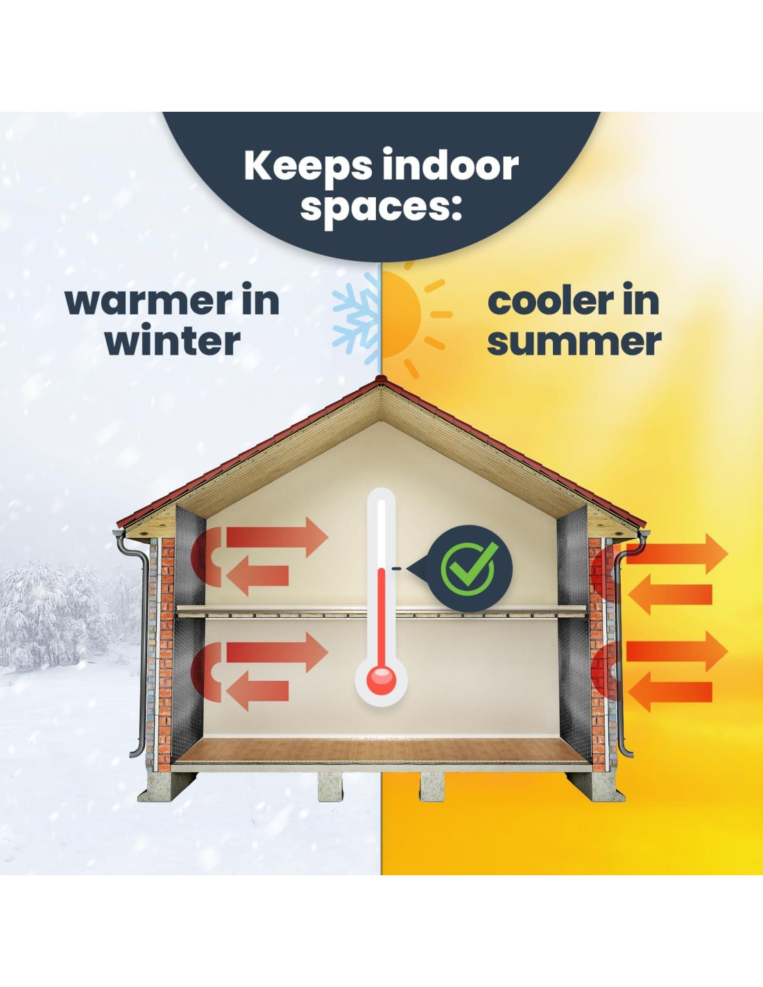 - REDUCIR EL USO DE ENERGÍA - Nuestro aislamiento térmico liviano reduce los costos de calefacción y aire acondicionado al bloquear el 96% del calor radiante. El aislamiento reflectante doble mantiene los espacios interiores cálidos en invierno y frescos en verano. Hecho en EE. UU.