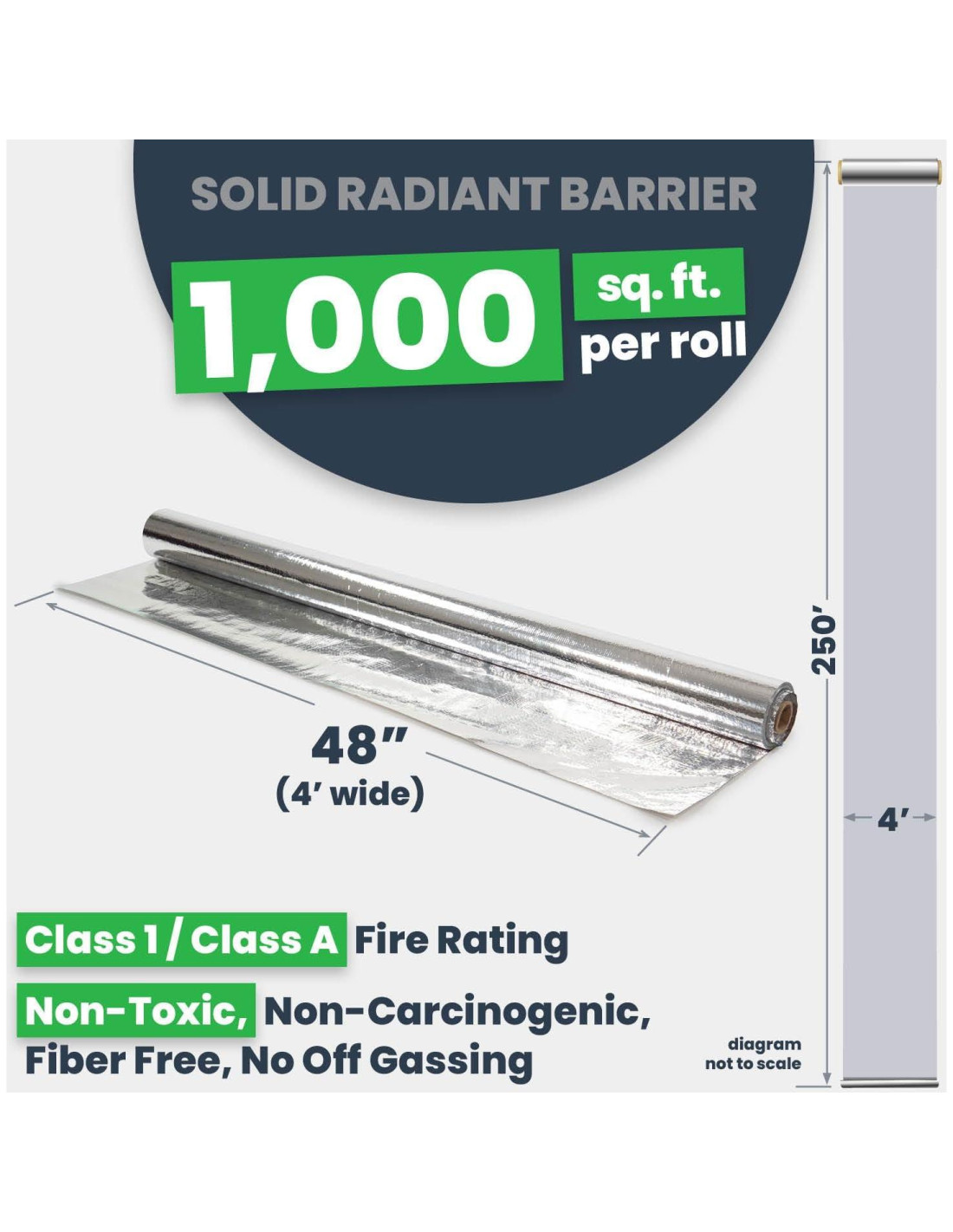 - ESPECIFICACIONES - Dimensiones: 4' x 125' | Superficie: 500 pies cuadrados (46.45 m) | Polietileno Unido a 2 Hojas de Barrera Radiante | Refleja 96%, 4% Emisivo | Clasificación de Fuego Clase 1 / Clase A | A Prueba de Desgarro | No Tóxico, No Cancerígeno, Libre de Fibra, Sin Emisiones