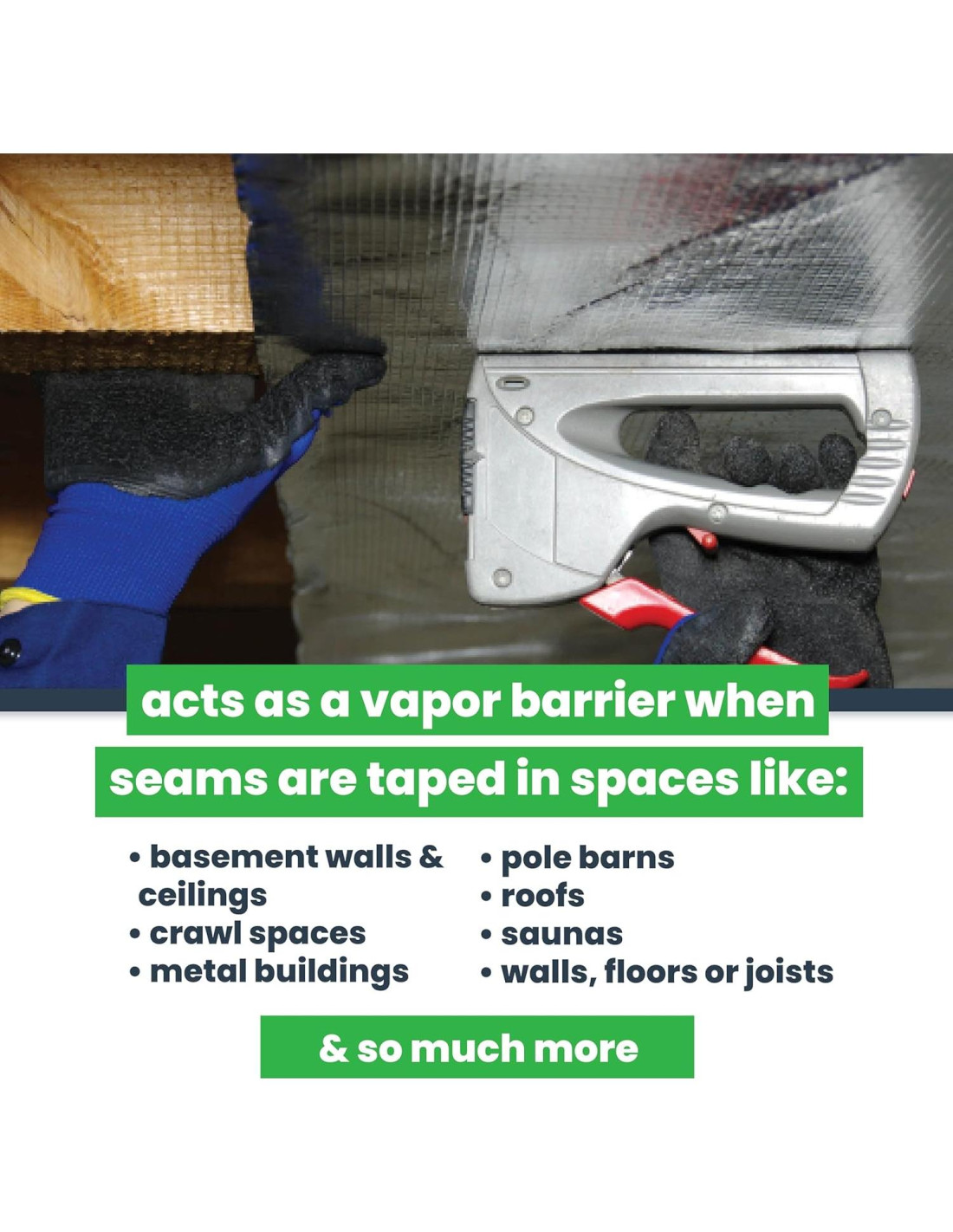- BARRERA DE VAPOR - El aislamiento de barrera radiante sólida previene el 100% de vapor de agua de pasar a tu hogar cuando todas las costuras están selladas. Funciona bien por sí solo, o se puede combinar con aislamiento tradicional de fibra de vidrio o espuma en aerosol.