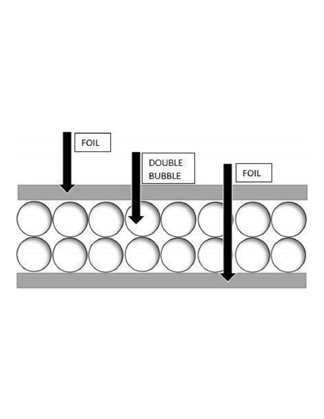 - Dos capas de burbujas de aire industrializadas de polietileno unidas entre dos capas de película de poliéster de aluminio metalizado altamente reflectante. Aislante de fuerza industrial, ligero pero duradero, diseñado para sostener grapas sin rasgarse. No se comprime, colapsa ni se desintegra. Refleja el 97% del calor radiante, emite menos del 3% de calor, barrera radiante clasificada como Clase 1 / Clase A que ha pasado la prueba ASTM E84 y ASTM E2599.