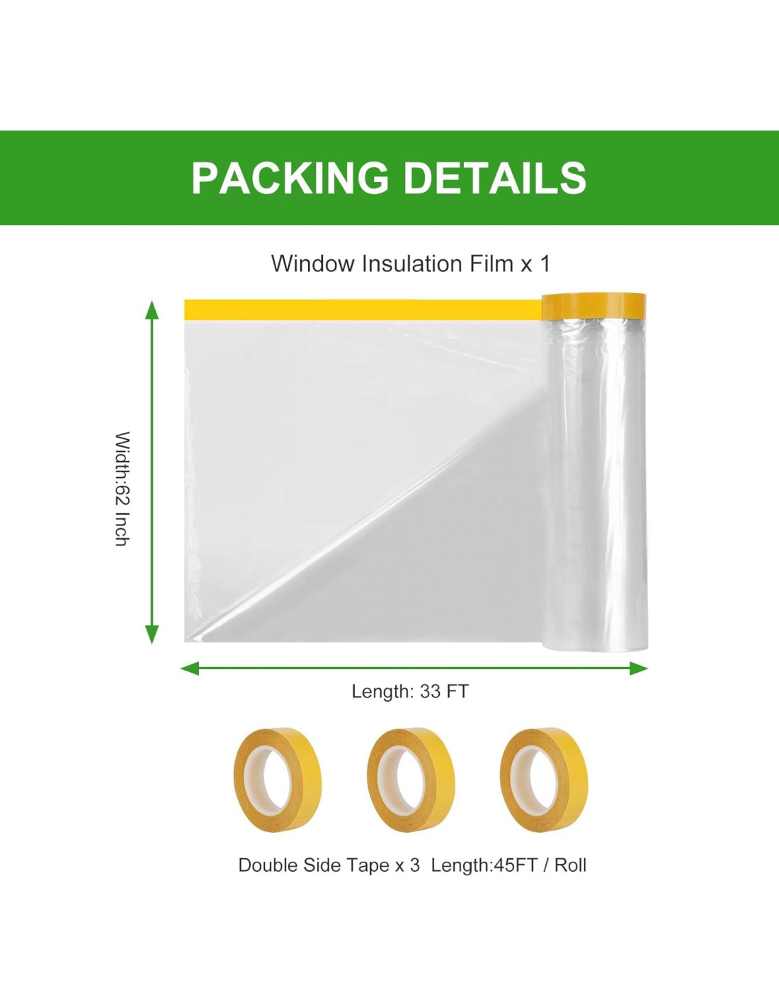 - LISTA DEL PAQUETE: Incluye 1 rollo de película de aislamiento para ventanas clara (tamaño: 63 pulgadas x 33 pies) y 3 rollos de cinta doble cara (45 pies/rollo, Total 135 pies)