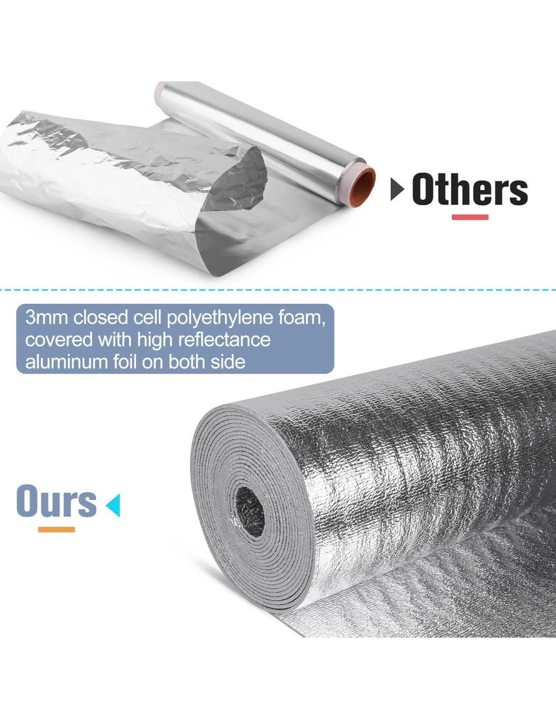- [Calidad Premium] Espuma de polietileno de celda cerrada de 3mm, cubierta con papel de aluminio de alta reflectancia en ambos lados, refleja efectivamente el 95% de la energía radiante, perfecta BARRERA RADIANTE. El diseño de la superficie ayuda a mantener su habitación más fresca en verano y más cálida en invierno