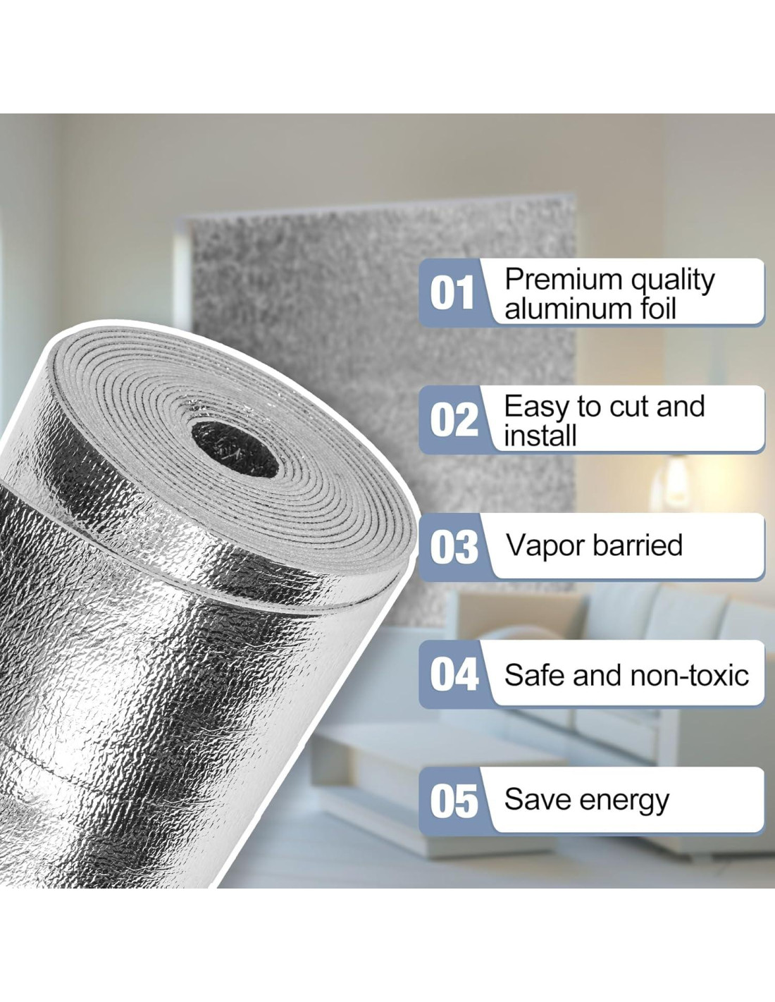 - [Ahorra Energía] El aislamiento con papel de aluminio de doble cara ayuda a reducir la carga en el sistema de calefacción o refrigeración, lo que le ahorra dinero en facturas de servicios. Además, proporciona beneficios de insonorización cuando se usa en paredes, techos y pisos