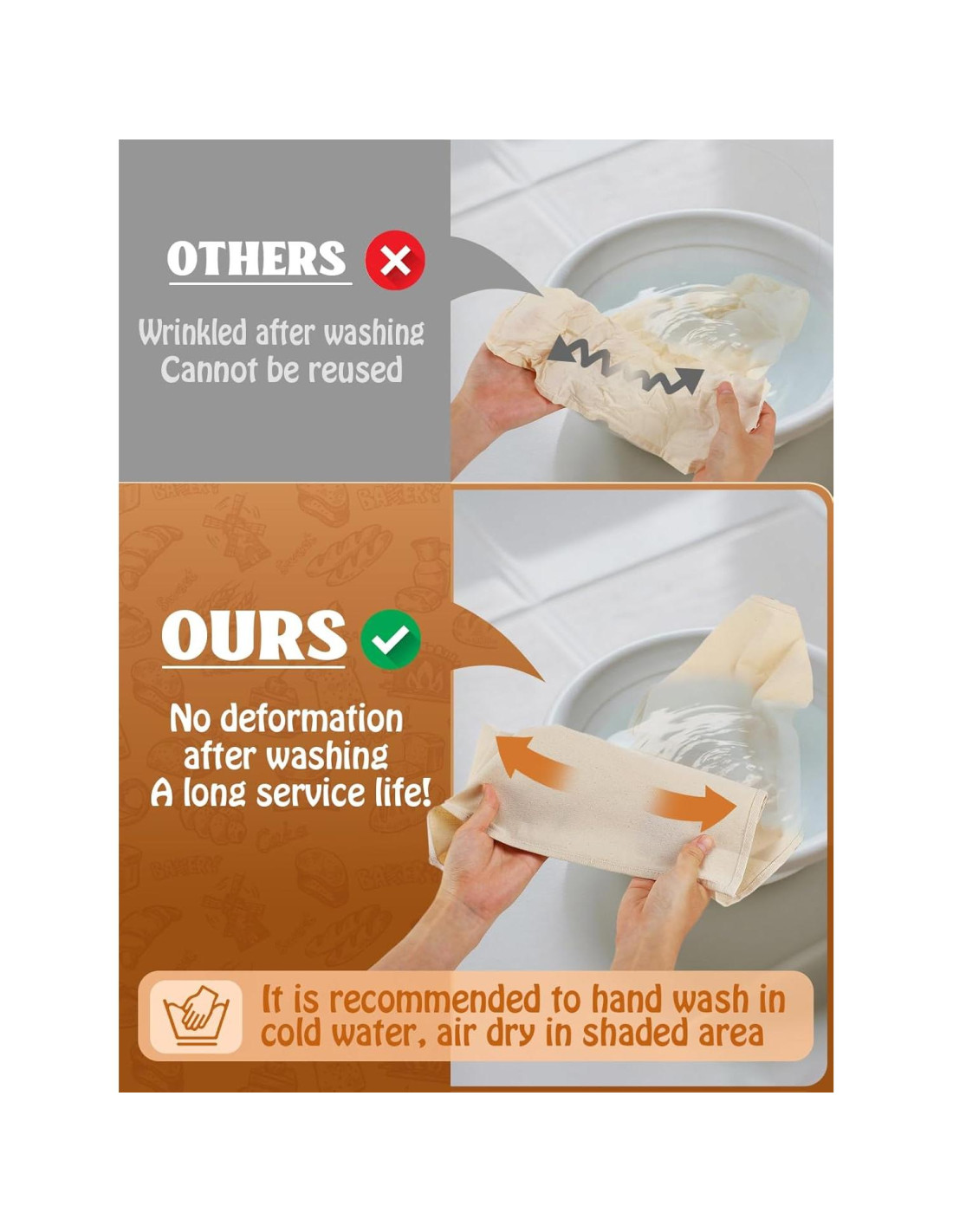 - Tela Mejorada, Menos Arrugas: Hecha de algodón puro de 190gsm, esta tela de fermentación resiste la deformación incluso después de lavarla. La tela gruesa y de alta calidad ofrece una excelente durabilidad, haciéndola resistente a desgarros y de larga duración, una herramienta esencial para cualquier panadero casero. Estas telas para hornear cuentan con bordes fuertes y doble costura para evitar deshilachados.