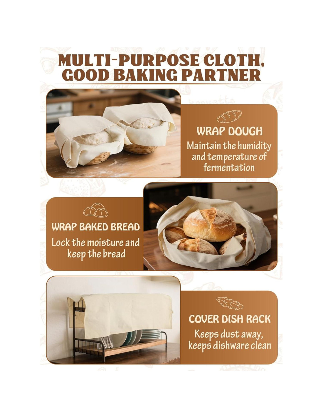 - Tamaño Grande, Uso Versátil: Recibirás 3 cubiertas de pan para el aumento de la masa. Cada tela mide 71 x 71 cm, proporcionando suficiente espacio para dar forma a hasta 5 baguettes. La tela suave pero duradera es perfecta no solo para dar forma a baguettes, sino también para cubrir cuencos de pan durante la fermentación y envolver masa madre horneada para protegerla del polvo.
