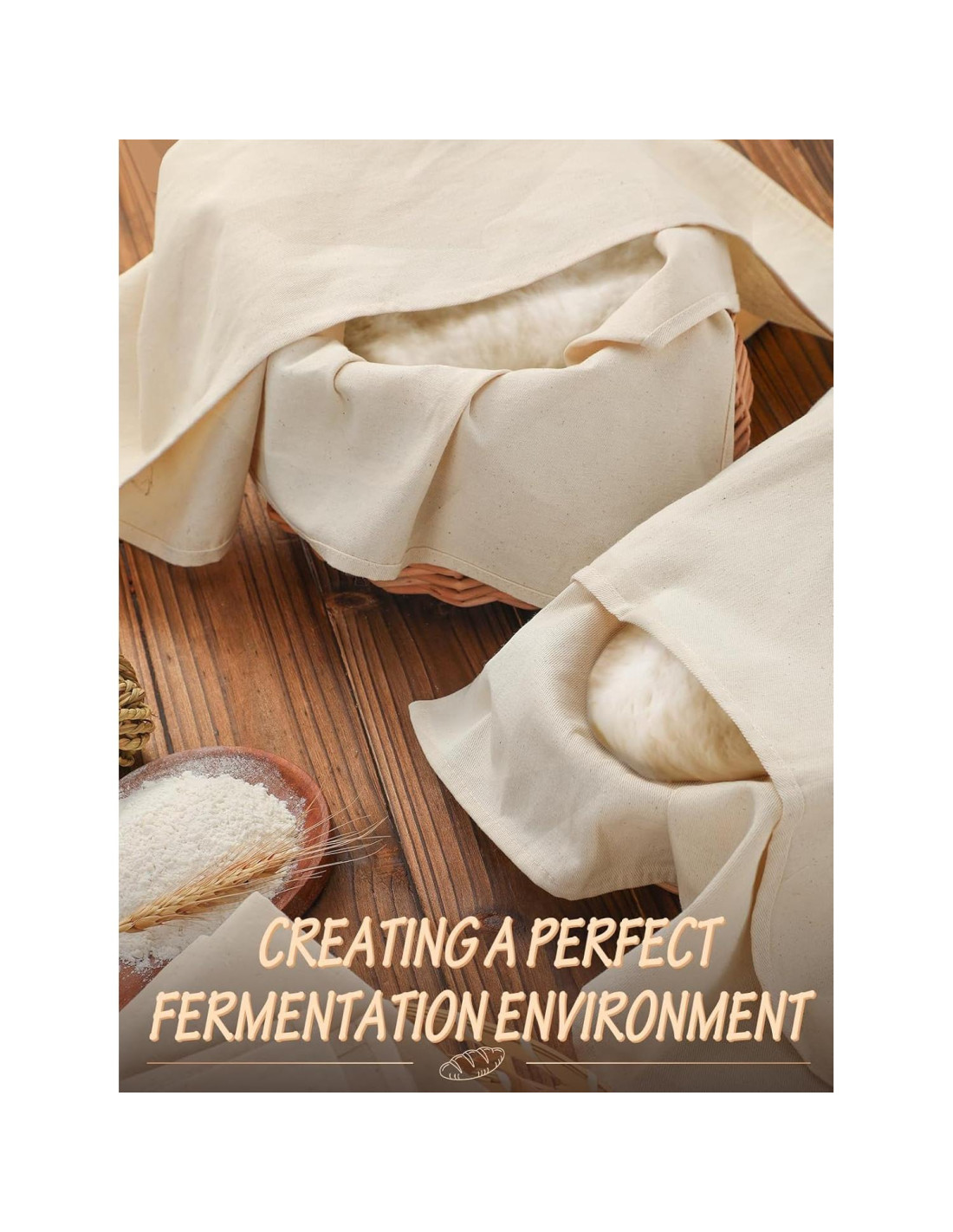 - Cubierta de Fermentación de Pan Transpirable: El material de algodón transpirable promueve la humedad adecuada para la fermentación de la masa, evitando que la masa se seque. Antes de colocar la masa, espolvorea un poco de harina sobre la tela, ayuda a transferir la masa suavemente sin pegarse o desgarrarse, asegurando una forma final perfecta.