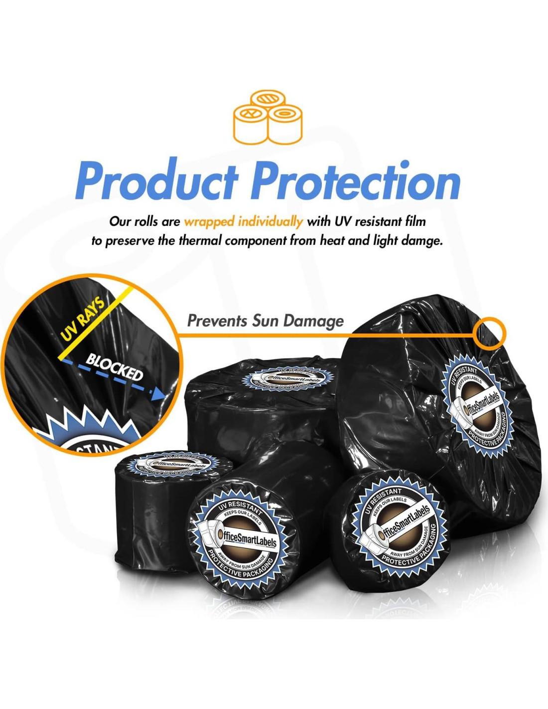 - [CARACTERÍSTICAS CLAVE]: Etiquetas de adhesivo térmico recubiertas con barrera de humedad y aceite para mayor capacidad resistente a la intemperie - Resistente a manchas, borrones, y rasguños - Adhesivo Permanente Poderoso; se adhiere y se mantiene seguro en prácticamente cualquier superficie
