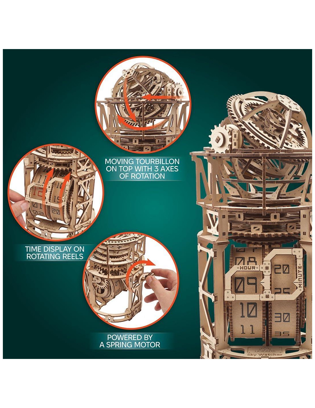 Ugears es una reconocida empresa ucraniana conocida por sus únicos rompecabezas mecánicos de madera 3D que combinan ingeniería con arte y un detalle excepcional. en negocio Más de rompecabezas 3D en catálogo Base de fans en países a través de continentes. El mecanismo tiene tres ejes de rotación: alrededor del eje vertical del reloj, eje horizontal del reloj y relativo al eje central de la esfera interior. El reloj de cuerda funciona basado en la acumulación de energía potencial en un resorte plano, y la liberación medida de esta energía. Tamaño del modelo: 12*7.1*6.5 in (30.5*18*16.5 cm) Tamaño del paquete: 14.9*6.7*1.8 in (37.8*17*4.5 cm) Número de componentes: 338 Tiempo estimado para ensamblaje: 15 horas Nivel: Avanzado Sky Watcher Ghost de Kyiv Aero Reloj Hot Rod Ratón Furioso Hexápodo Explorador Celesta Drift Cobra Coche de Carreras