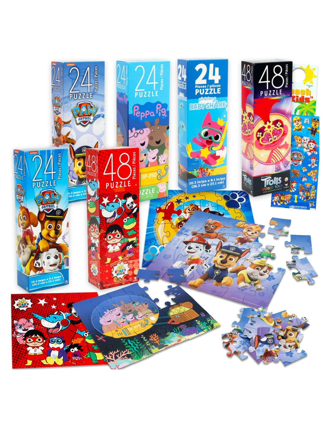 - Este paquete de rompecabezas para niñas y niños incluye 4 rompecabezas diferentes de 24 piezas: rompecabezas de Peppa Pig, rompecabezas de Baby Shark, dos rompecabezas de Paw Patrol. Este conjunto también incluye dos rompecabezas de 48 piezas que representan obras de arte de Ryan's World y Trolls. No hay rompecabezas duplicados.