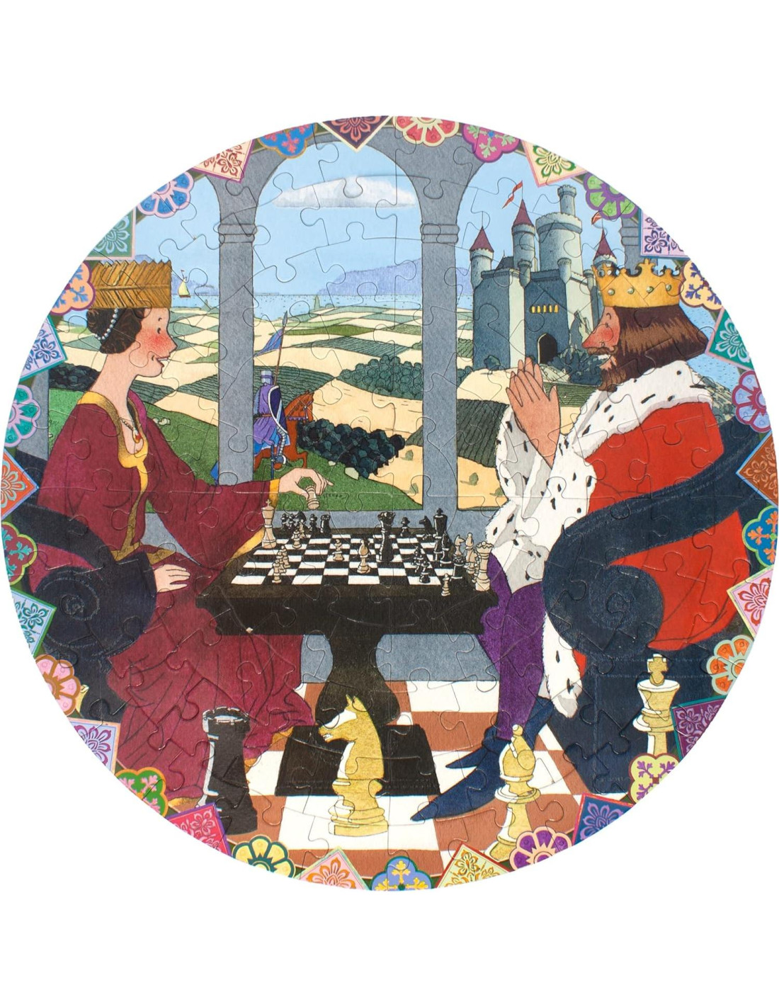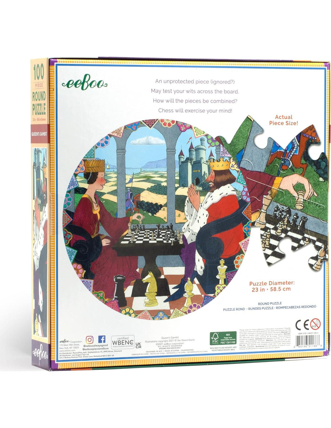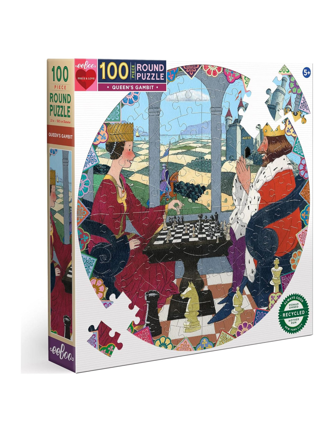 El rompecabezas redondo de 100 piezas de la Reina Gambito de eeBoo presenta una obra de arte del querido ilustrador Yan Nascimbene. La Reina Gambito representa un mundo fantástico en el que un Rey y una Reina compiten en un tablero de ajedrez con un paisaje ondulante detrás de ellos que encarna el territorio abstracto por el que compiten. El rompecabezas redondo de 100 piezas es un híbrido especial para niños mayores listos para temas más avanzados y un mayor número de piezas, pero también para adultos que desean un rompecabezas más simple que se pueda completar en menos tiempo. El rompecabezas terminado tiene un diámetro de 23 pulgadas (58,42 cm). Propiedad de mujeres y dirigido por una madre, eeBoo crea actividades saludables que fomentan la imaginación e inspiran la conversación y la colaboración entre pares y a través de generaciones. Durante más de 25 años, hemos producido regalos y juegos seguros y ambientalmente sostenibles para familias y niños de todas las edades y niveles de aprendizaje. eeBoo ofrece un currículo de habilidades de desarrollo que ayudan a construir la confianza, la resolución creativa de problemas, la alfabetización, la navegación social, el respeto por nuestras diferencias y una mayor apreciación del planeta que todos compartimos.