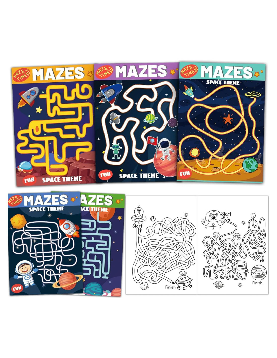 - SET DE 6 LIBROS de Laberintos con Tema Espacial El paquete contiene 6 libros de laberintos con un tema espacial para niños. Cada libro consta de 28 laberintos. En total, hay 168 diseños únicos y 6 niveles de dificultad diferentes, que van desde fácil hasta desafiante. Además, los niños pueden colorear los patrones y personajes espaciales que rodean los laberintos.