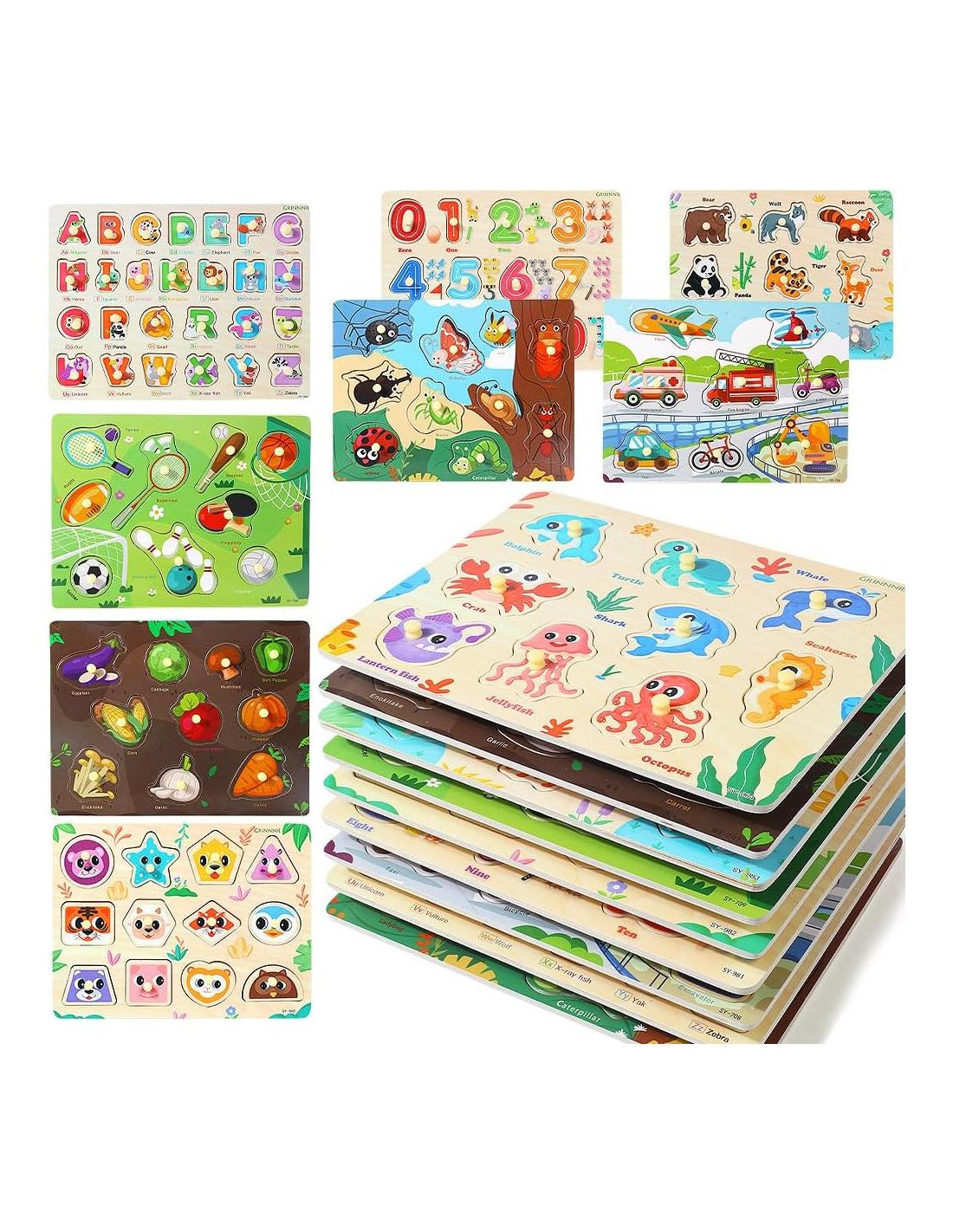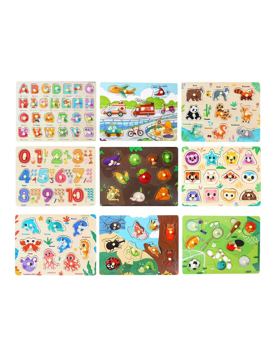 - 9 PCS PUZZLE DE MADERA PARA NIÑOS PEQUEÑOS: El paquete incluye 1 caja de regalo, 9 puzzles para niños pequeños - puzzle de alfabeto, puzzle de números, puzzle de formas, puzzle de vehículos, puzzle de animales, puzzle de verduras, puzzle de criaturas marinas, puzzle de insectos, puzzle de juegos de pelota.