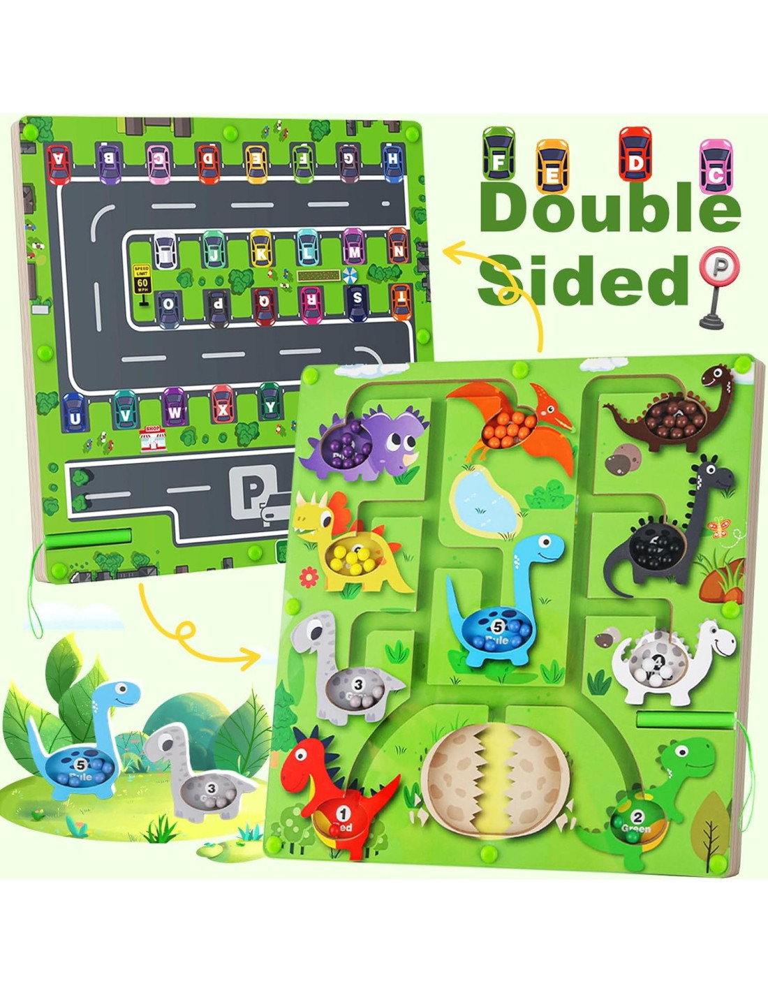 - Doble Aprendizaje, Doble Diversión: Este tablero de laberinto magnético de 2 en 1 mantiene a los niños comprometidos con un colorido juego de emparejamiento de colores con temática de dinosaurios en un lado y un emocionante laberinto de alfabeto con temática de coches en el otro. ¡Es perfecto para enseñar el reconocimiento de letras y la clasificación de colores, dos habilidades críticas en un solo juguete!