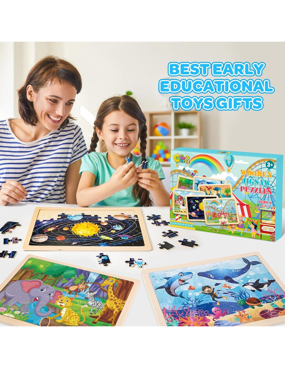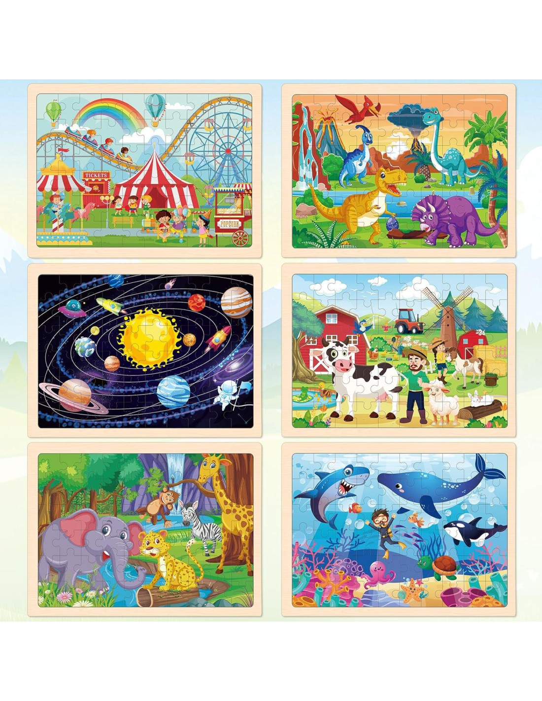 - 6 Rompecabezas para Niños - Paquete de 6 rompecabezas de madera de 60 piezas para niños de 3 a 5 años. Los juguetes de madera incluyen rompecabezas de parque de diversiones, dinosaurios, espacio, granja, animales y océano. Fáciles, divertidos, maravillosos: los juguetes educativos de rompecabezas de formas desarrollan la coordinación mano-ojo, habilidades motoras finas y pensamiento creativo
