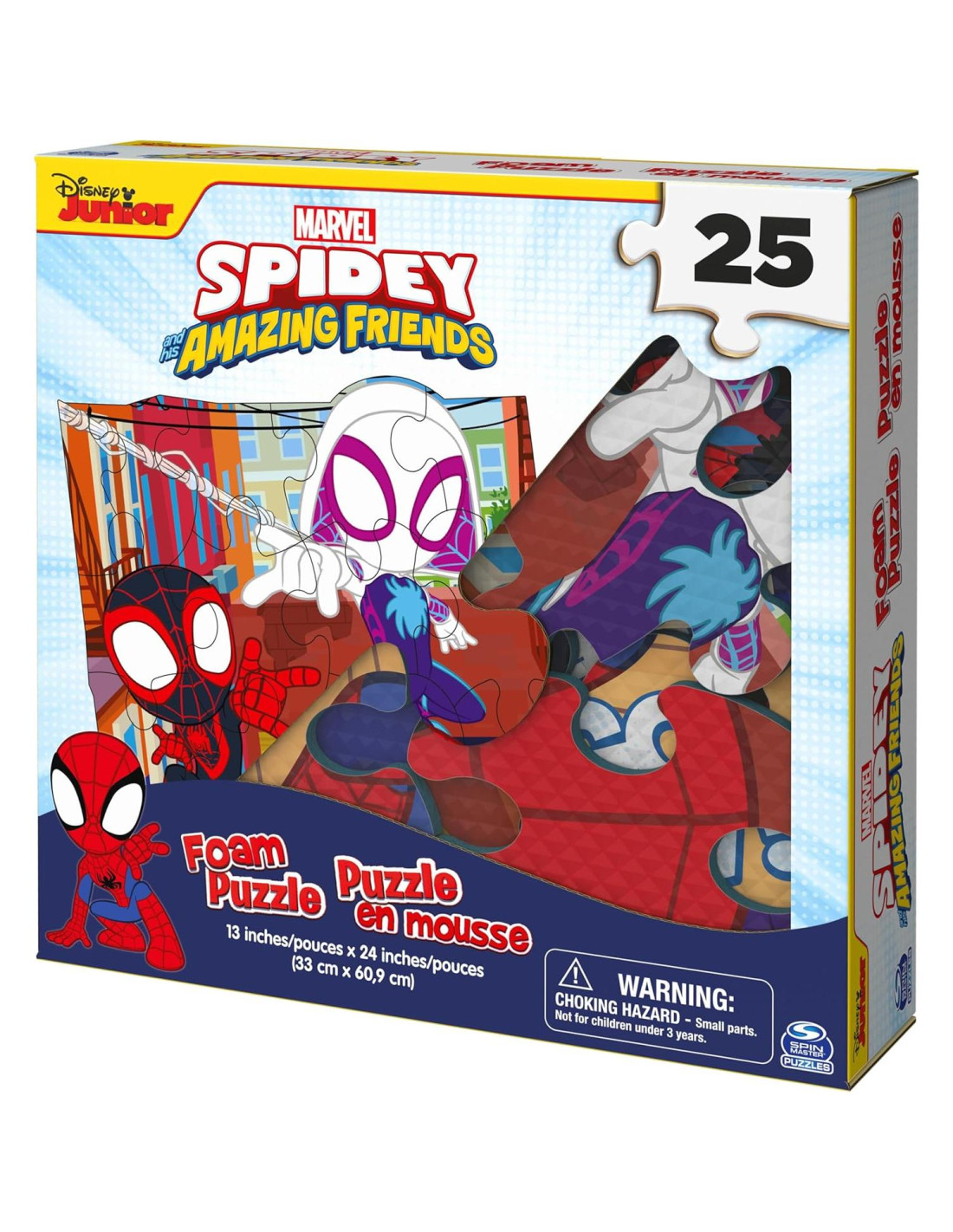 De Disney Junior, este rompecabezas de Spidey y sus Amigos Asombrosos pronto se convertirá en el favorito en tu casa. Ideal para niños pequeños, este rompecabezas de espuma se siente flexible al tacto y es excelente para armar en el suelo. Obtienes esta imagen de rompecabezas de superhéroe 'Ve Spidey.' con Peter, Miles y Gwen listos para la acción. Con solo 25 piezas, este rompecabezas es adecuado para todos los niños de 4 años en adelante. Presentará un desafío emocionante, pero manejable que será divertido y ayudará con su desarrollo de aprendizaje. A tus hijos les encantará ver a Spidey y sus Amigos Asombrosos en este rompecabezas de espuma. Tiene toda la diversión colorida y la aventura que les encanta ver en el programa de televisión Disney Junior. Ya sea que tu pequeño sea fan de Peter, Miles o Gwen, seguramente estarán obsesionados con esta colorida actividad de rompecabezas táctil. Este rompecabezas es uno de muchos juegos y rompecabezas de Marvel, y será un gran regalo para cualquier niño o niña que ame las películas. Prepárate ahora para las fiestas, cumpleaños y más. Revive todas tus escenas favoritas del divertido programa con este rompecabezas de espuma lleno de acción.