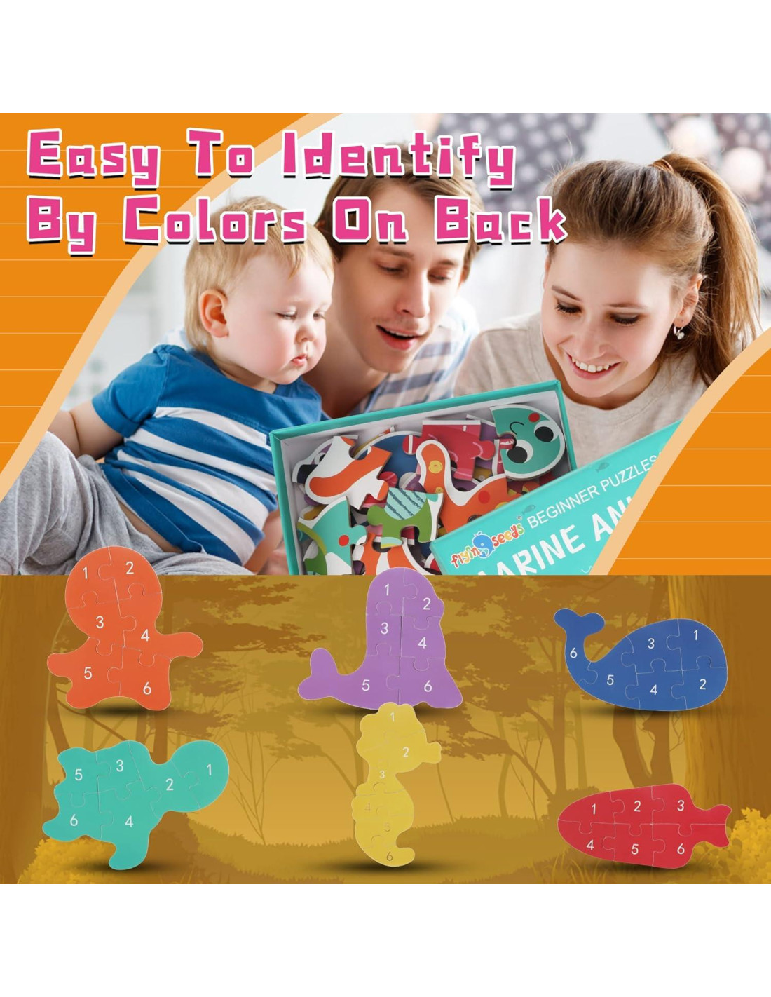 - [Seis Rompecabezas con Temática Marina] Los Rompecabezas con Forma de Animales Marinos de FLYINGSEEDS incluyen seis rompecabezas de 6 piezas que presentan una Ballena, Pulpo, Pez, Tortuga Marina, León Marino y Caballito de Mar.