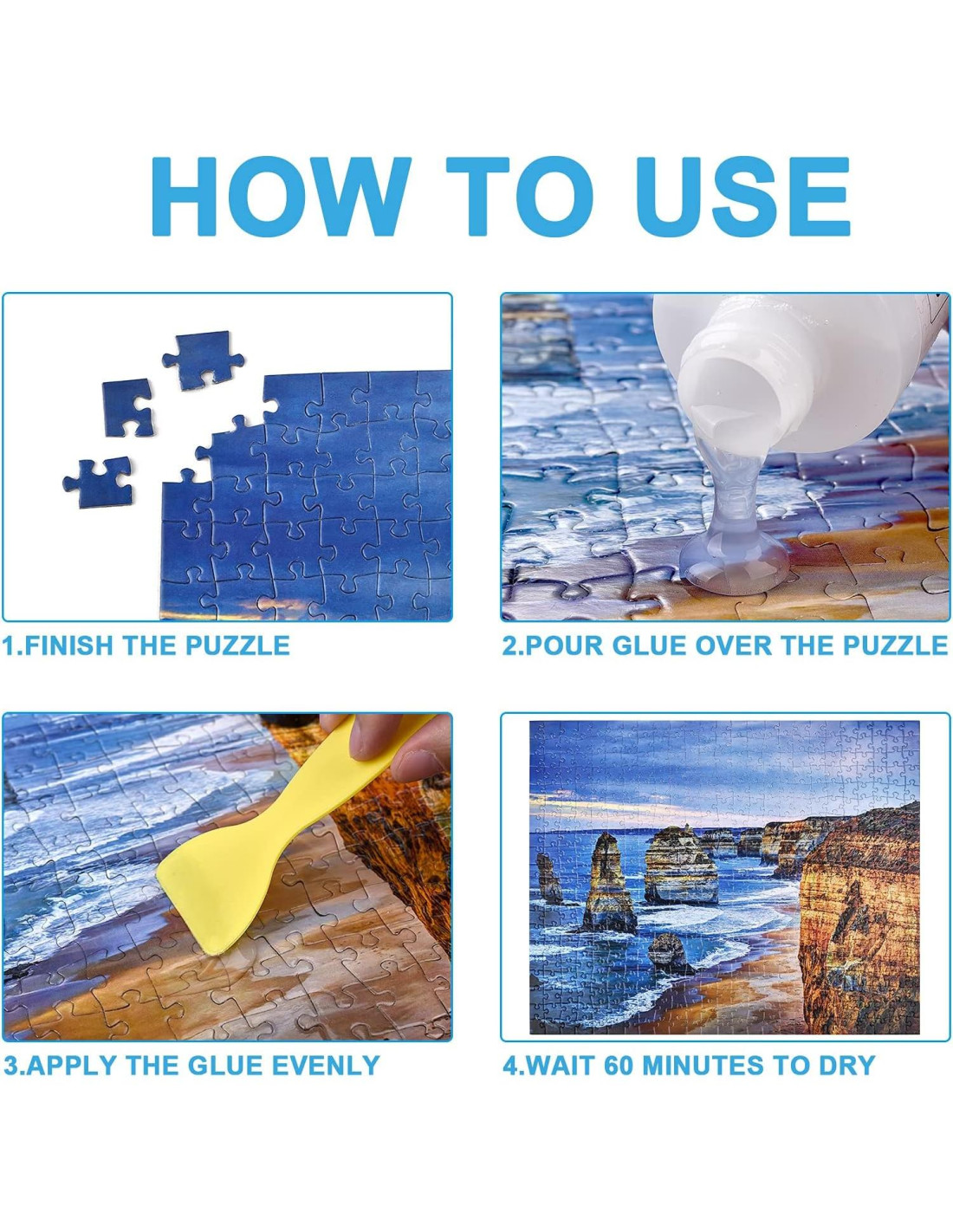 - [Excelente Calidad] Hemos mejorado la fórmula del pegamento. Después de aplicarlo, tu rompecabezas puede seguir luciendo brillante y no se oscurecerá. La espátula te ayuda a aplicar el pegamento de manera uniforme y rápida, lo que es simple y conveniente.