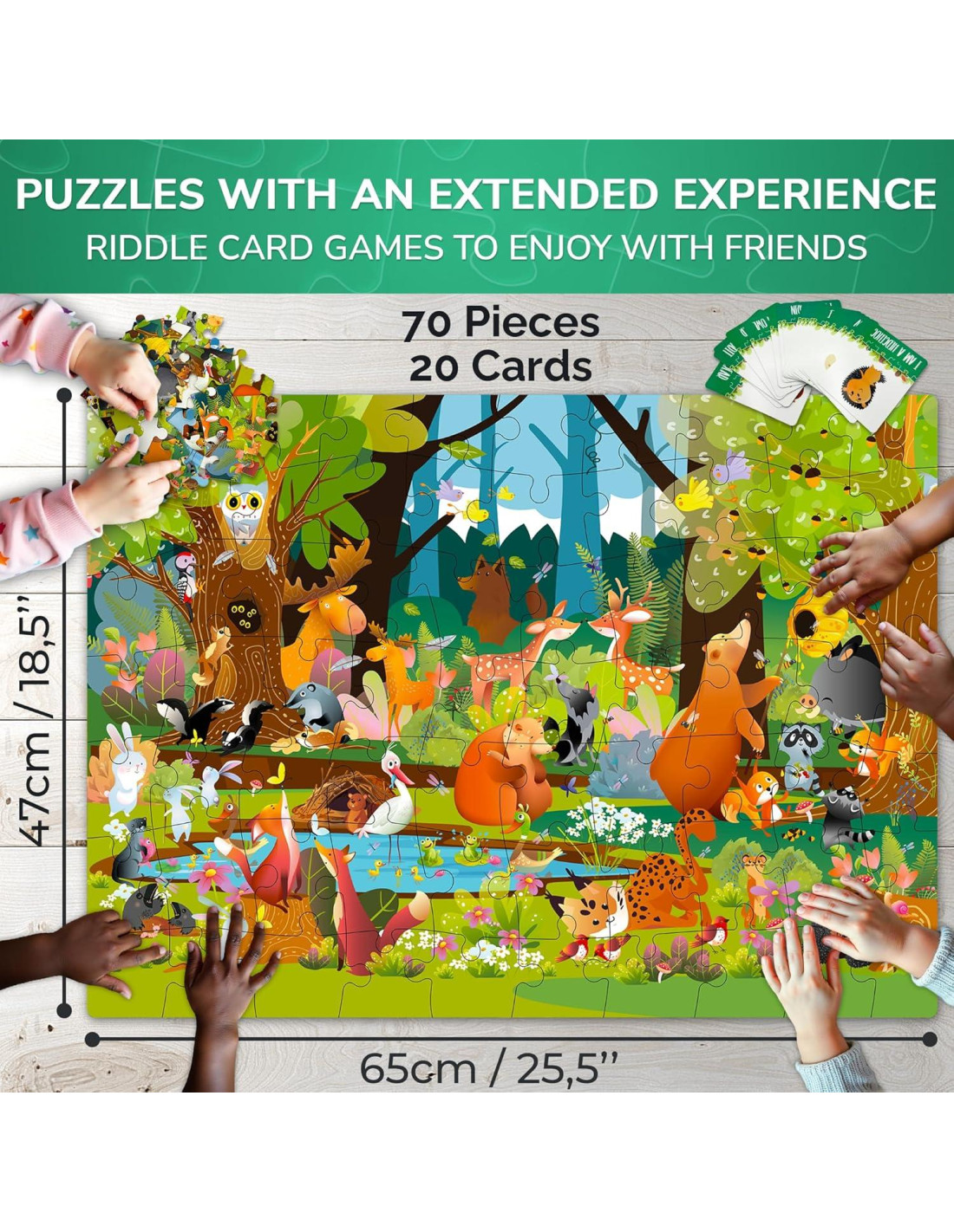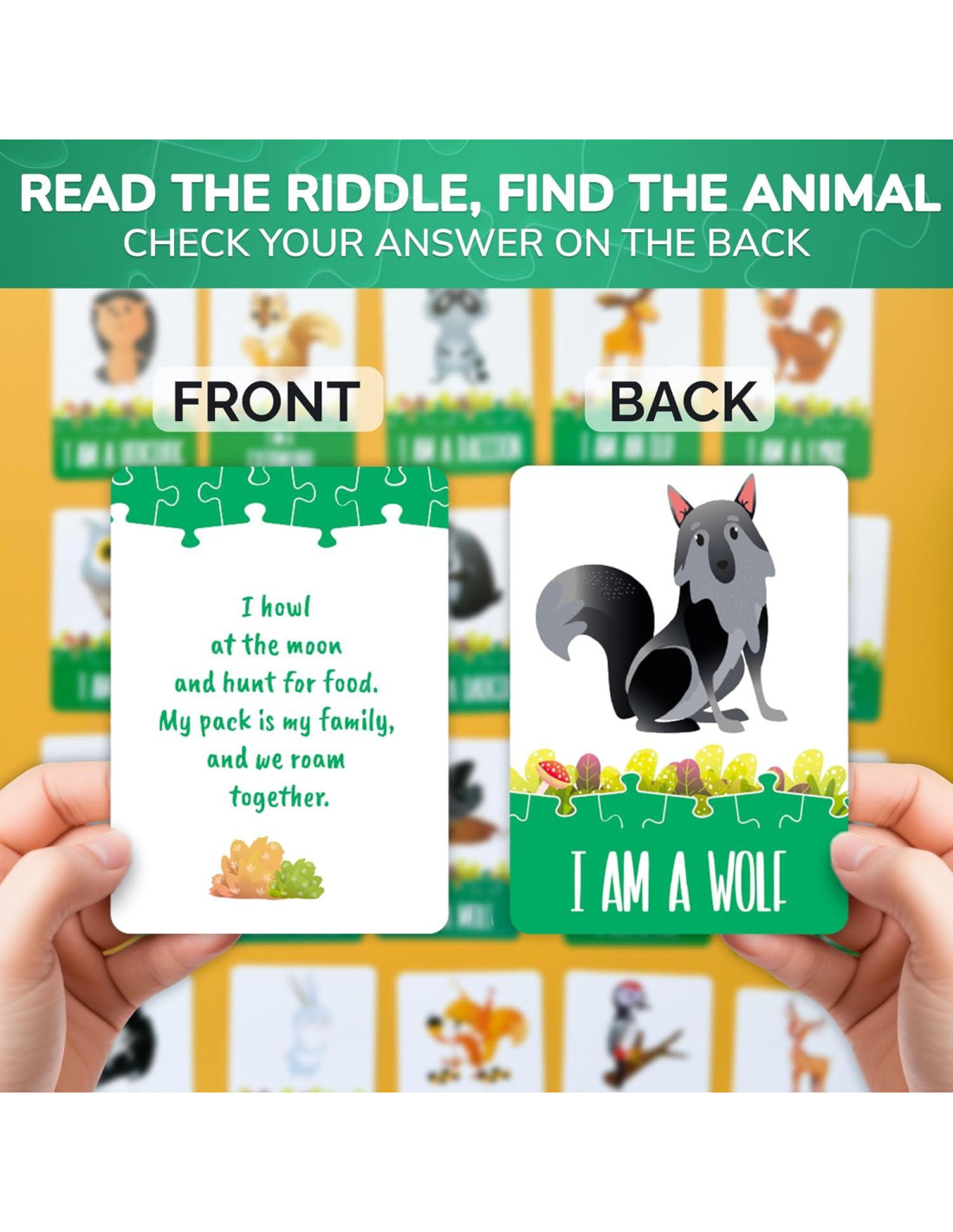 - RESOLVER ADIVINANZAS EN TARJETAS: 20 tarjetas de adivinanza con divertidas adivinanzas de animales; Los niños resuelven la adivinanza primero y luego buscan el animal correspondiente en casi 100 piezas de puzzles para niños; Esta combinación mejora las habilidades de resolución de problemas y pensamiento crítico