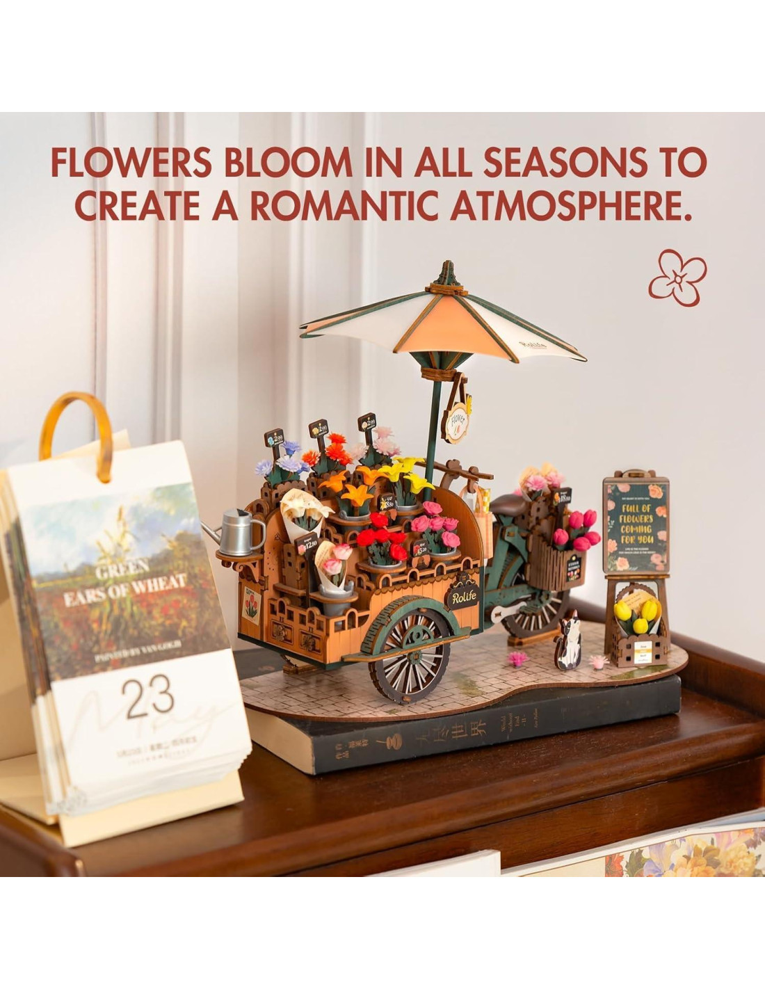 - [Estética de Decoración del Hogar] Este modelo de rompecabezas de madera 3D en la esquina de una habitación refleja el espíritu romántico del propietario, con flores vibrantes que calman cualquier inquietud. Reemplaza tu lugar habitual de vegetación con este encantador carrito de flores.