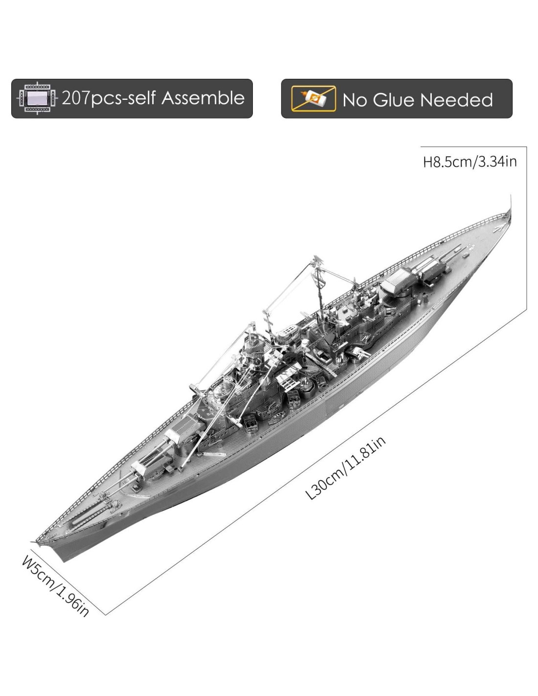 El acorazado Bismarck fue el primero de los acorazados de la clase Bismarck construidos por Alemania antes de la Segunda Guerra Mundial en el astillero Hans Blom a finales de la década de 1930 y nombrado en honor al ex Primer Ministro alemán Bismarck. El acorazado Bismarck mide 241.55 metros (791 pies) de largo, 36 metros (118 pies) de ancho, con un calado máximo de 9.99 metros (32.8 pies), un desplazamiento estándar de 41,637 toneladas (45,800 toneladas cortas), un desplazamiento a plena carga de 50,300 toneladas (55,500 toneladas cortas), una velocidad máxima de 30.12 nudos (55.7 km/h) y una resistencia máxima de 8,500 millas náuticas (15,700 km). Equipado con 8 cañones principales de 380 mm, 12 cañones secundarios de 150 mm y 36 cañones, el barco fue uno de los acorazados durante la Segunda Guerra Mundial. El acorazado Bismarck se inició en julio de 1936, se botó el 14 de febrero de 1939 y se comisionó el 24 de agosto de 1940. Fue el acorazado más grande y tecnológicamente avanzado de Alemania en ese momento. Rompecabezas 3D desafiantes - Rompecabezas de metal 3D de Piececool para adultos o adolescentes mayores de 16 años. Puede tardar más de 7 horas en completarse, dependiendo de su experiencia y paciencia. El complejo kit de arte DIY de metal unirá a las familias durante horas para crear algo verdaderamente único para exhibir en su hogar. Créanos, este es un tiempo familiar inolvidable, se sorprenderá con el talento práctico del niño. Regalos creativos perfectos - Los productos terminados son realmente hermosos y delicados, decóralos en tu escritorio o estante, obras de arte hechas por ti. Será un buen regalo para Cumpleaños, Día de San Valentín, Día del Padre, Día del Maestro, Navidad, Acción de Gracias, Año Nuevo, etc. Juguetes educativos y de alivio del estrés - Libera tu presión laboral, disfruta de horas de diversión con tu familia y amigos del proceso de construcción del rompecabezas de metal 3D, además, los bloques de construcción de modelos de metal 3D inspirarán y promoverán nuestra capacidad de concentración, habilidades para resolver problemas y habilidades de razonamiento visual y espacial. Decoración del hogar exquisita y única - El kit de manualidades de metal no solo es funcional e interesante, sino que también está bellamente diseñado. Tienen un diseño decorativo y se ven muy encantadores cuando se terminan. Exhibe una pieza verdaderamente única de artesanía de metal en tus escritorios, estanterías o mesitas de noche.