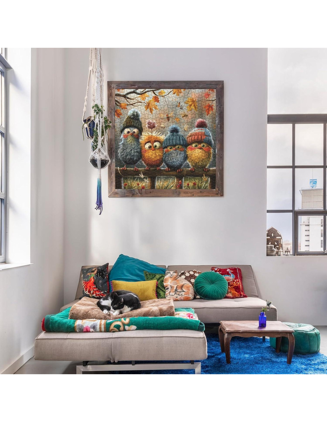 - Compañeros Acogedores de Otoño: Celebra la calidez de la unión con cuatro encantadoras aves acurrucadas en una cerca, tres usando gorros de lana. Este rompecabezas otoñal conmovedor combina fantasía y arte, perfecto para noches acogedoras y decoración estacional