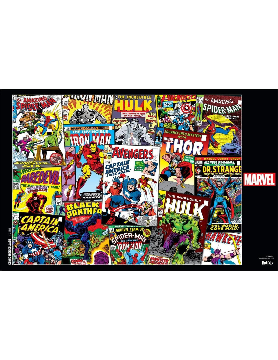 Este rompecabezas de 1000 piezas de Marvel de Buffalo Games presenta un collage de portadas de cómics vintage de muchos queridos superhéroes de Marvel, incluyendo Capitán América, Iron Man, Hulk, y más. Cada rompecabezas de Buffalo Games está fabricado con tablero de rompecabezas reciclado. Una técnica de corte de precisión garantiza que cada pieza encaje perfectamente con la firma Perfect Snap. También se incluye un póster de rompecabezas adicional para que tengas una referencia útil de cómo debería verse el rompecabezas completado mientras armas el tuyo. 2023 MARVEL