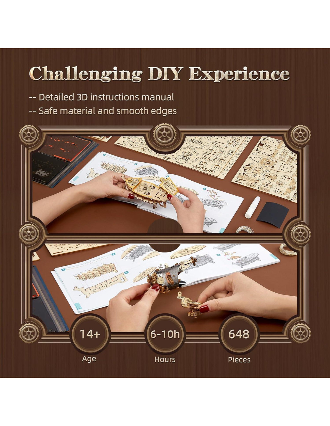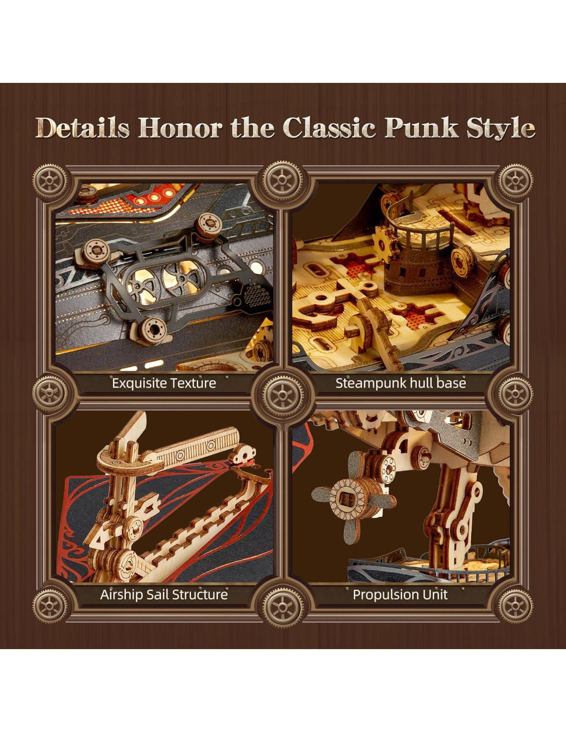 - Diseño de Aeronave Fantasía Steampunk Experimenta la maravilla del cielo con este rompecabezas de aeronave de madera 3D. Inspirado en el encantador estilo steampunk, cuenta con texturas intrincadas y un diseño impresionante, completo con una hipnotizante exhibición de luces LED que despierta la creatividad y la maravilla.